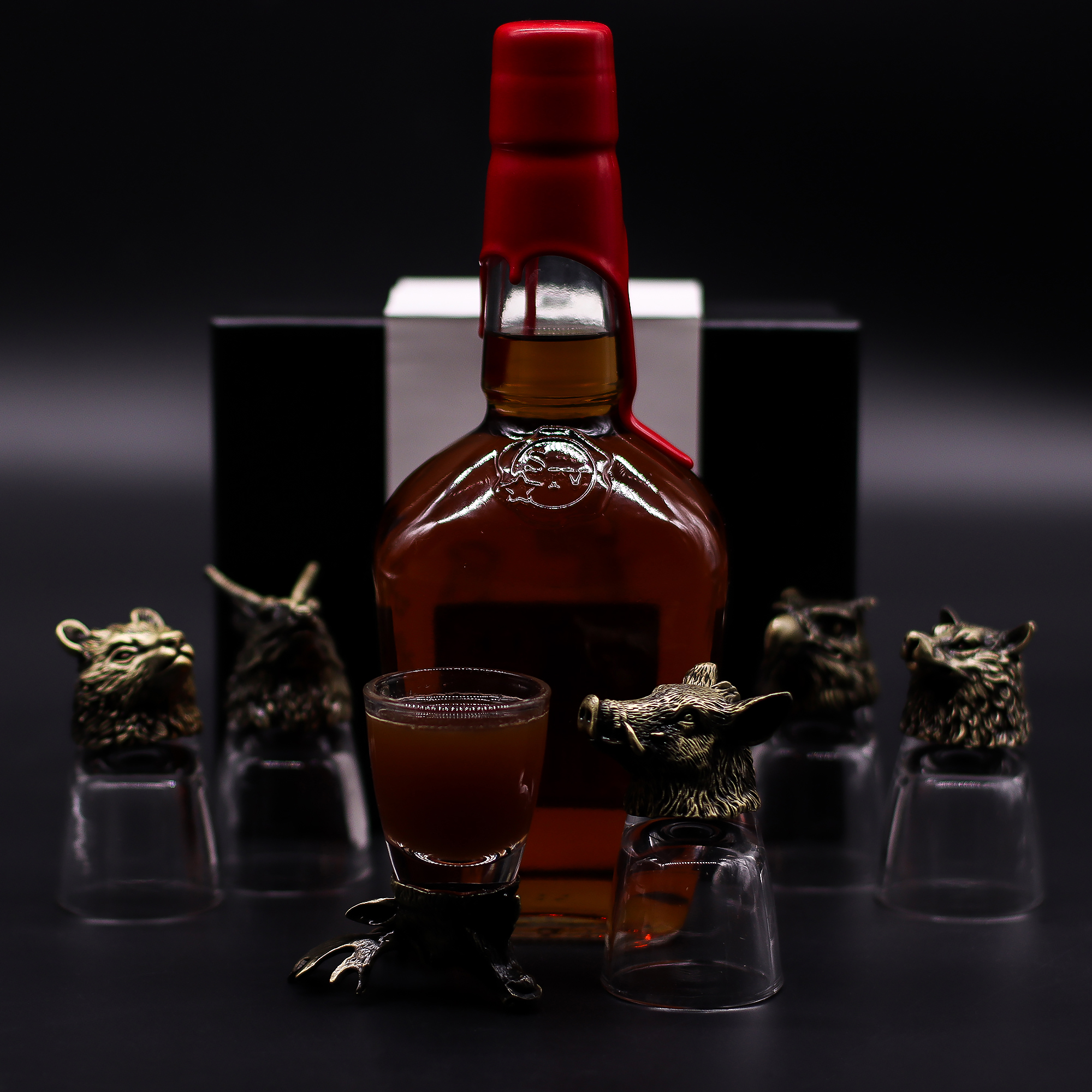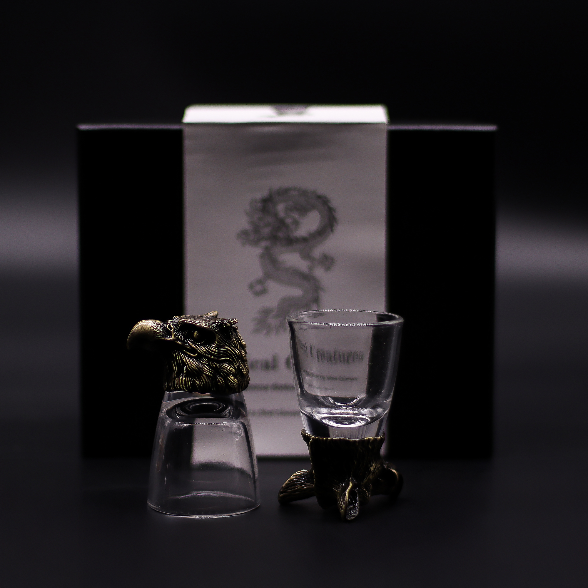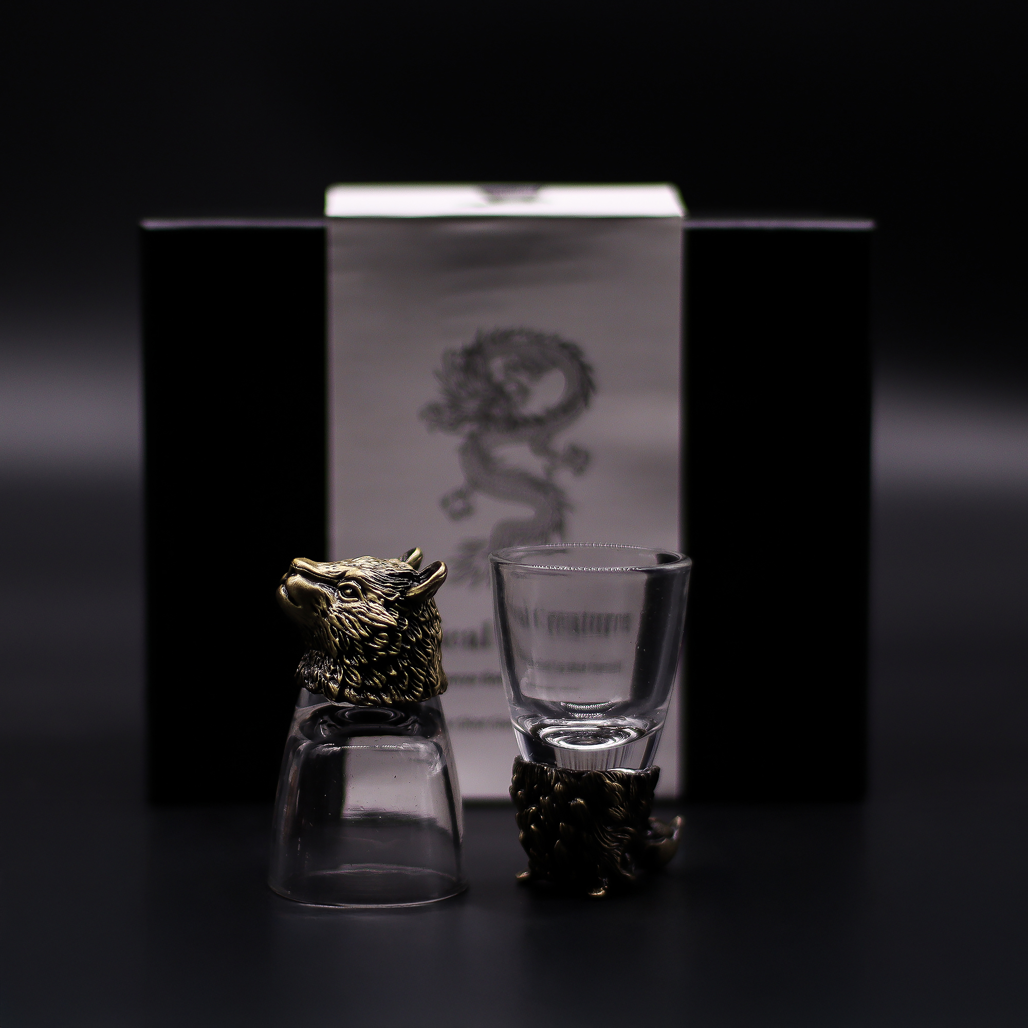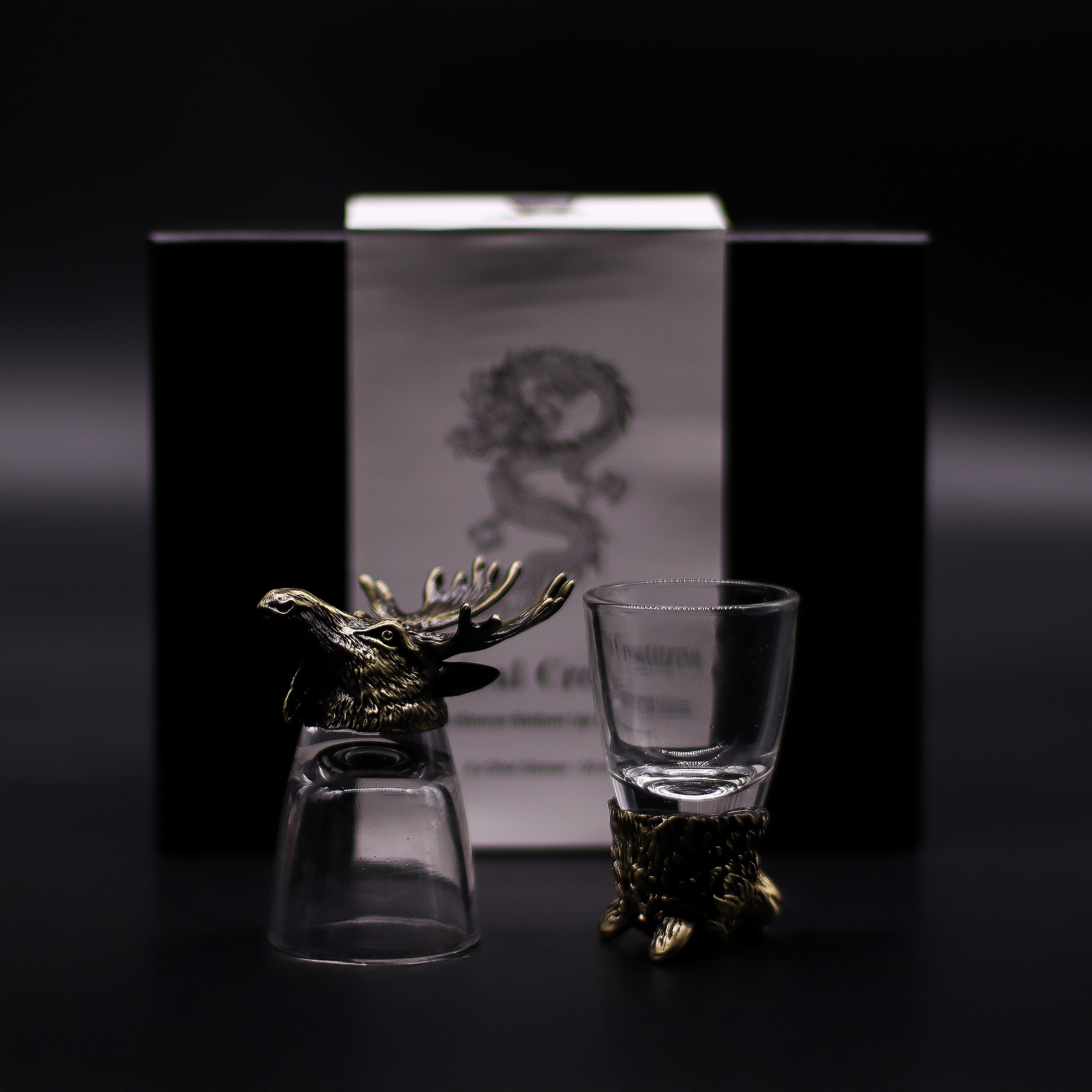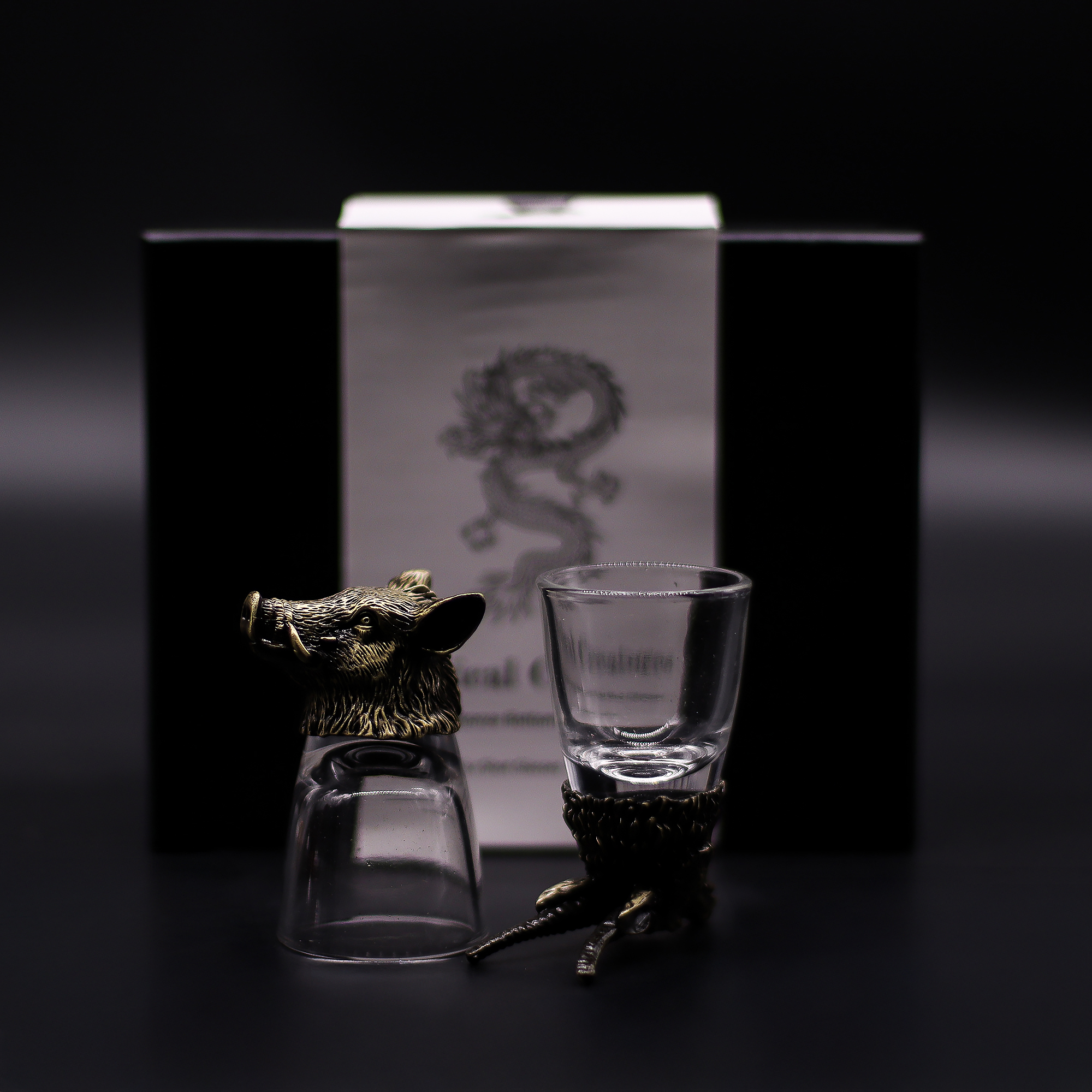 Tato šestidílná sada s motivem divokých lesních tvorů oslavuje nezkrotnou krásu přírody s výjimečným řemeslným zpracováním. Každá sklenice o objemu 50 ml spočívá na tvarovaném mosazném podstavci s motivy lesních zvířat, jako je jelen, medvěd, orel, koza, kanec a vlk.