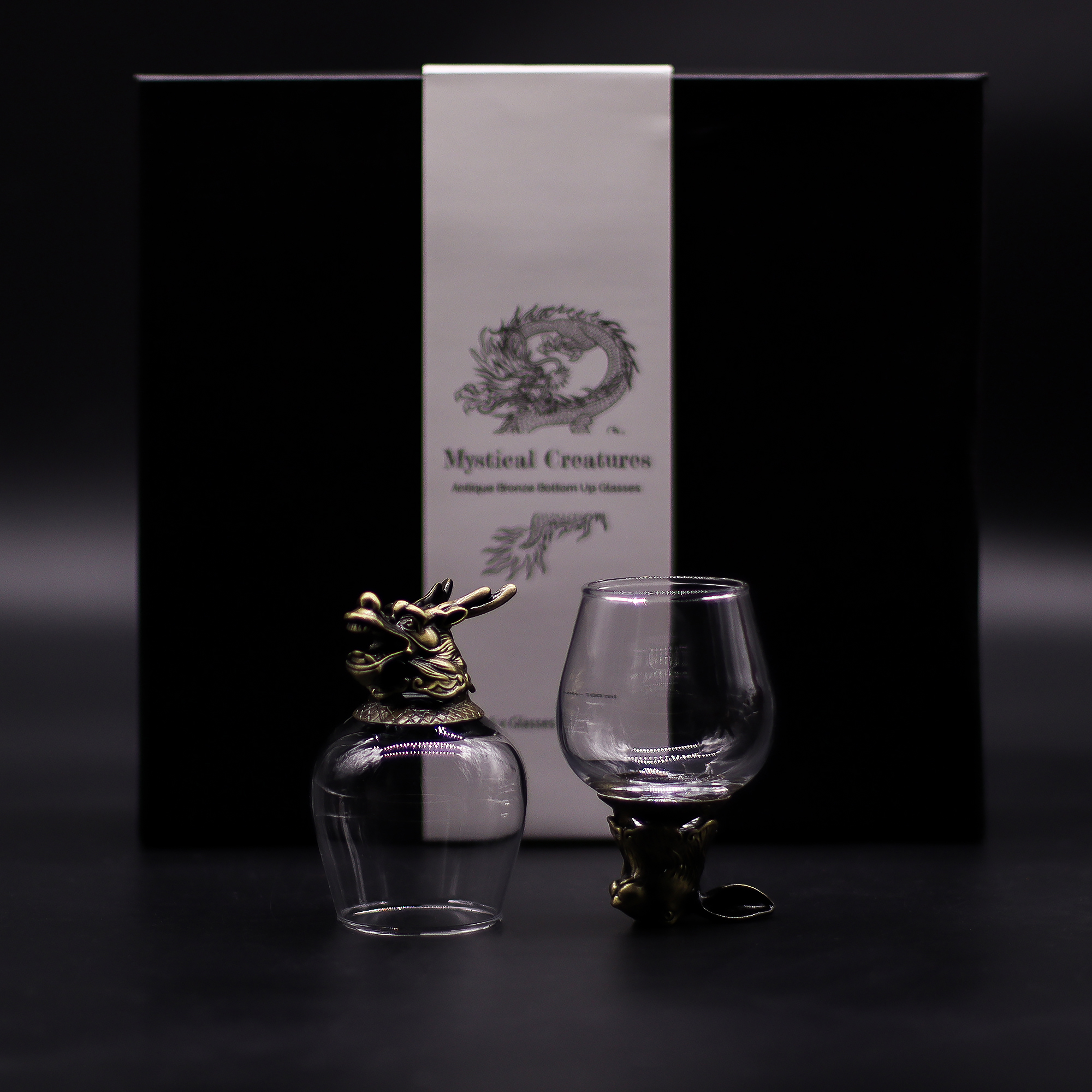Každá sklenice má těžkou mosaznou základnu vymodelovanou do podoby mytických bytostí, jako je drak, kobra, tygr, slon, koza a beran – krásně detailní a plné charakteru.