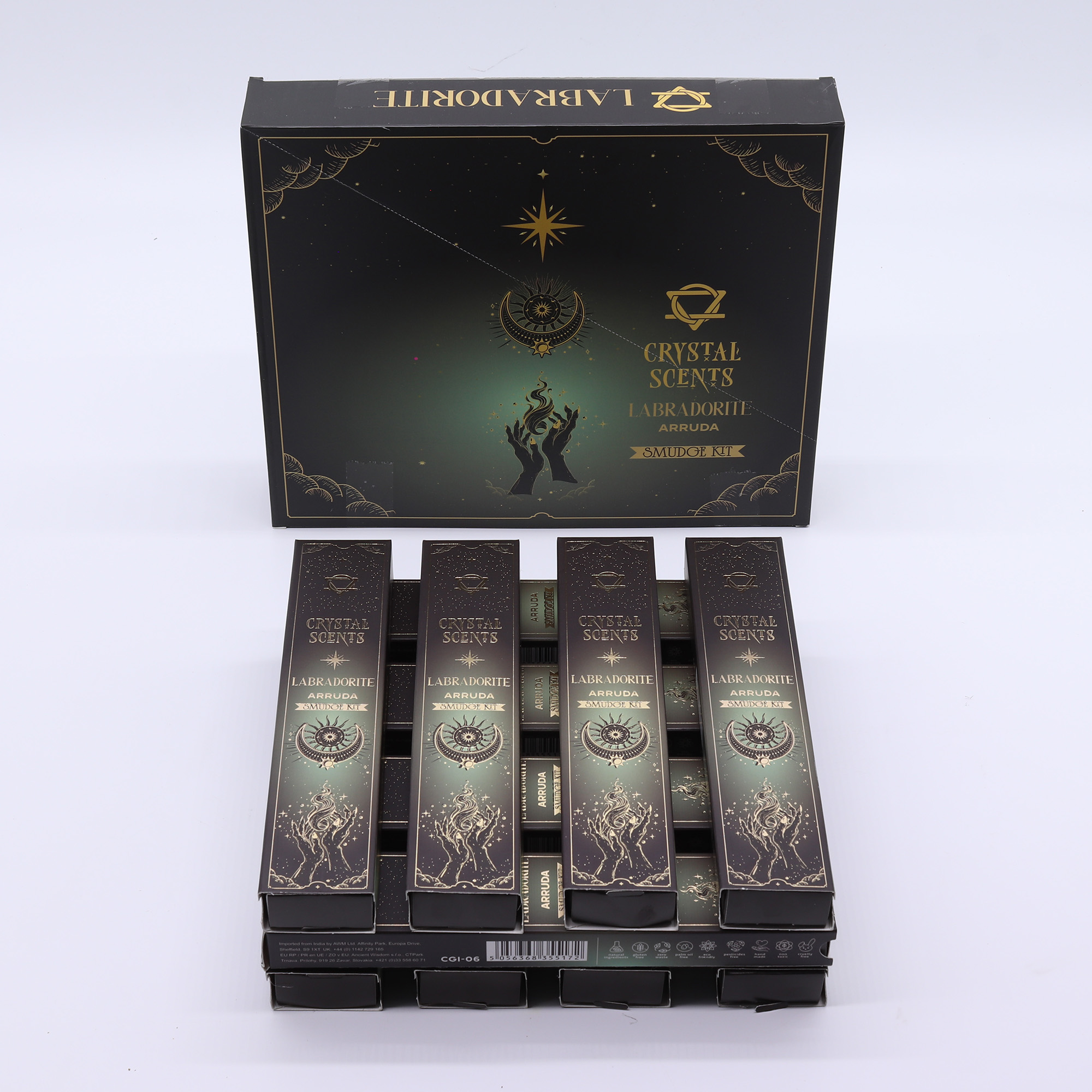 V kombinaci s ostrou, očistnou vůní arrudy pomáhá kadidlo vytvořit prostor, který se cítí osvěžený a energeticky čistý. Každé balení obsahuje 10 ručně vyrobených tyčinek a pravé krystaly labradoritu, což je ideální pro spirituální butiky a prodejce zaměřené na wellness. Zákazníci si toto spojení často vybírají v přechodných fázích nebo když chtějí vytvořit uzemněnější a intuitivnější prostředí.