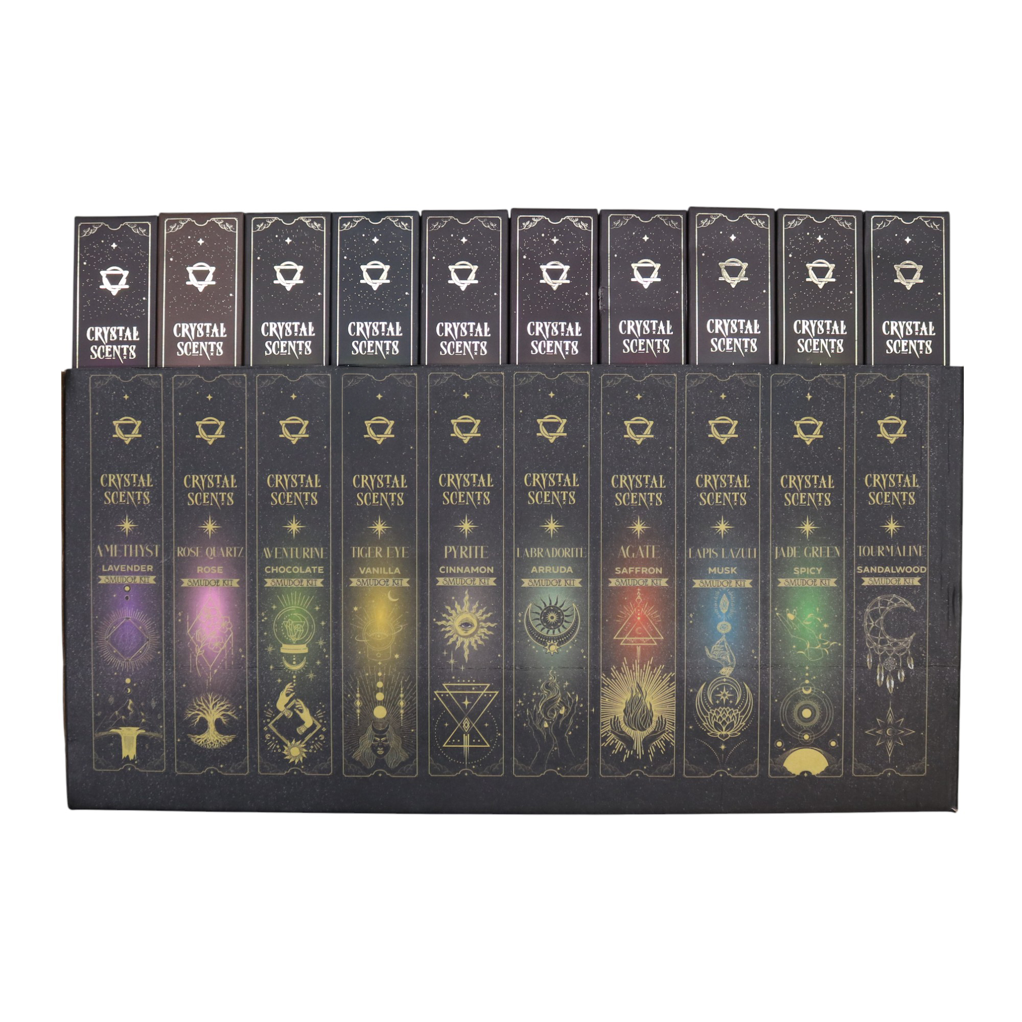 Objevte plné kouzlo naší kolekce vonných tyčinek s touto kompletní startovací sadou. Každá sada obsahuje 60 balení připravených k prodeji – 6 balení od každé z našich 10 charakteristických vůní – které nabízejí rozmanité aroma a energie krystalů, aby vyhovovaly každému záměru a prostoru.