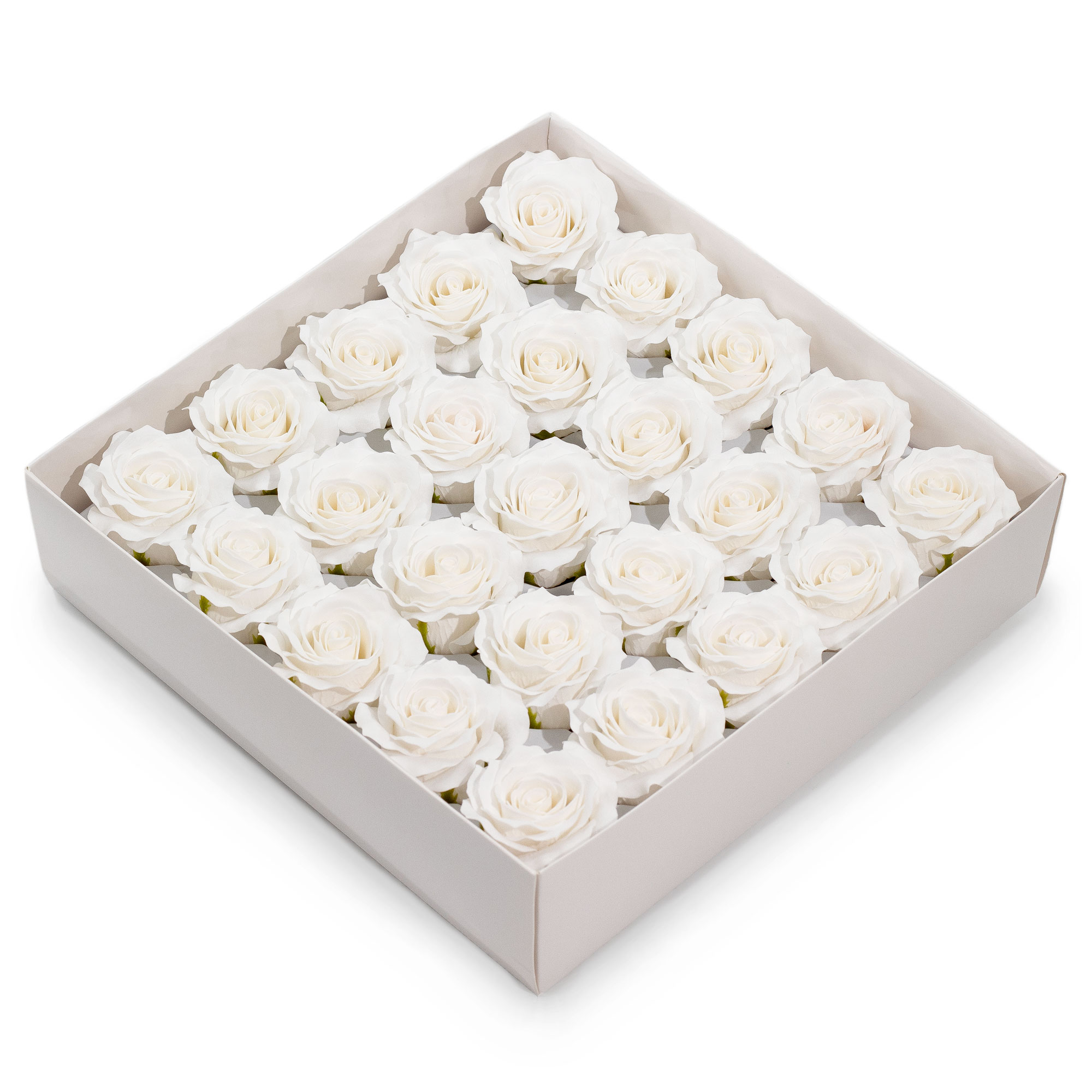 Klasické a elegantní bílé romantické mýdlové růže dodají nadčasový nádech každému dárku nebo dekoraci. Každá krabička obsahuje 25 pětivrstvých růží, vyrobených s propracovanými detaily, které připomínají čerstvé květy.