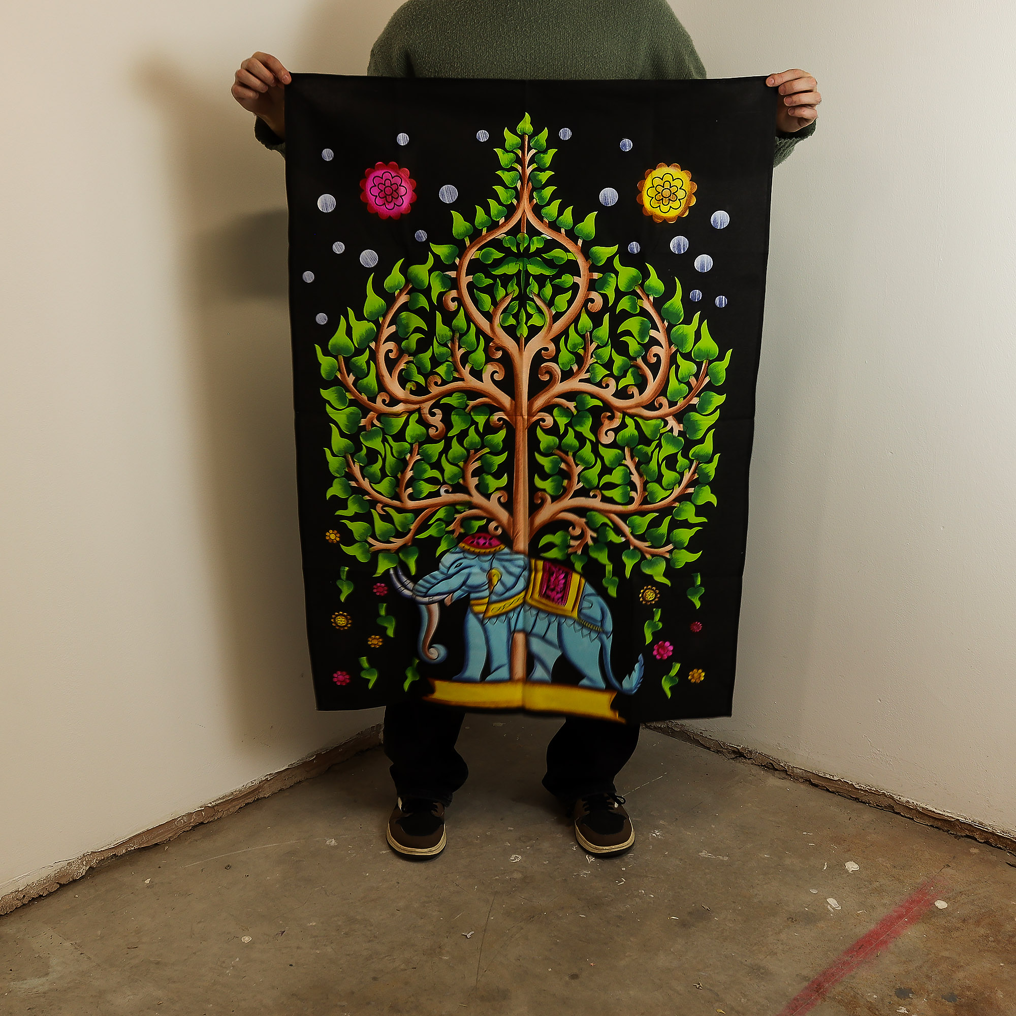 Tato nástěnná dekorace o rozměrech 70x110 cm funguje stejně dobře jako gobelín, přehoz na postel nebo slavnostní dekorace. Každý kus je ručně vyráběn v Indii a jednotlivě balen v ochranném polyetylenovém sáčku s visačkou pro snadné vystavení v maloobchodě. Zjistíte, že je obzvláště atraktivní pro bytové dekorace, dárky a kolekce s wellness tématikou.