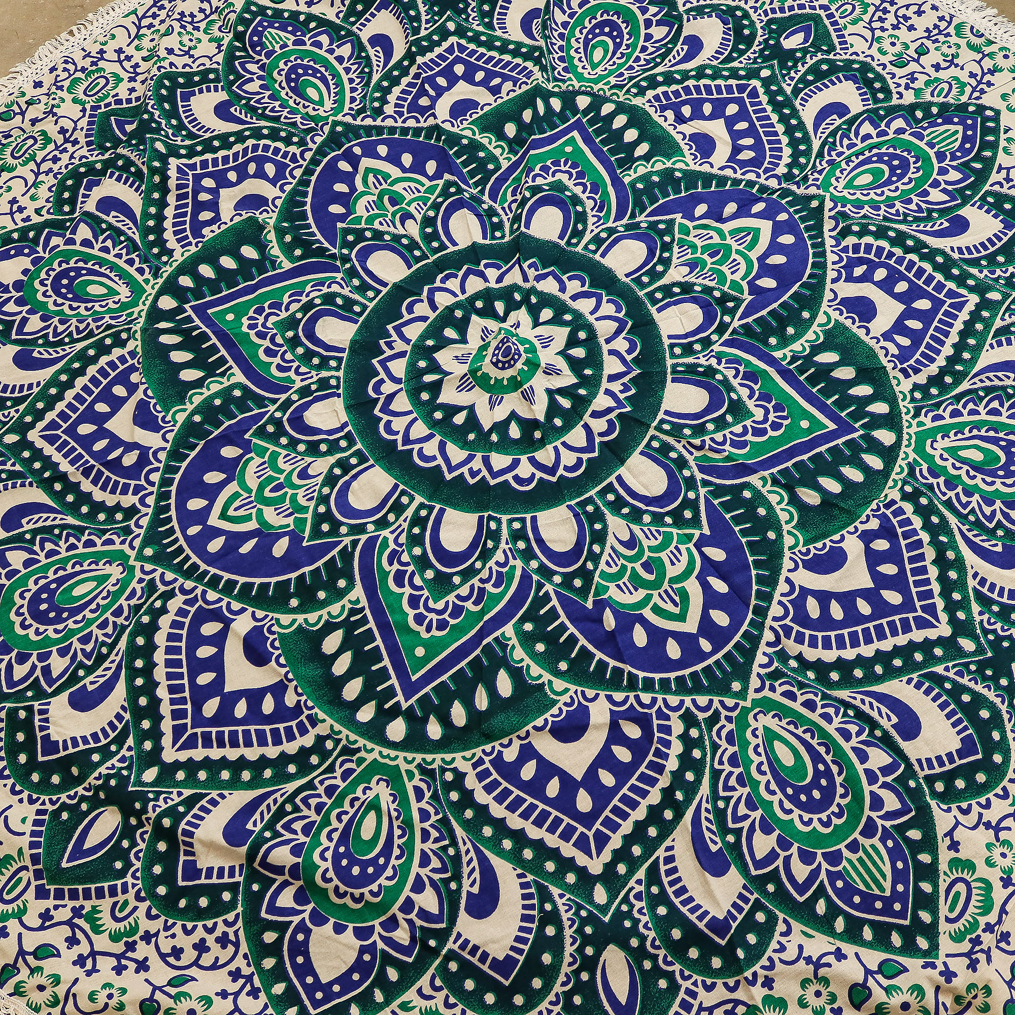 Pochází z Indie a zobrazuje mandalu – staletí starý symbol rovnováhy a meditace – což z něj činí ideální volbu pro bytové dekorace, wellness a prodejce duchovních potřeb. S délkou 130 cm je dostatečně všestranné, aby sloužilo jako nástěnná dekorace, meditační podložka nebo cestovní doplněk.