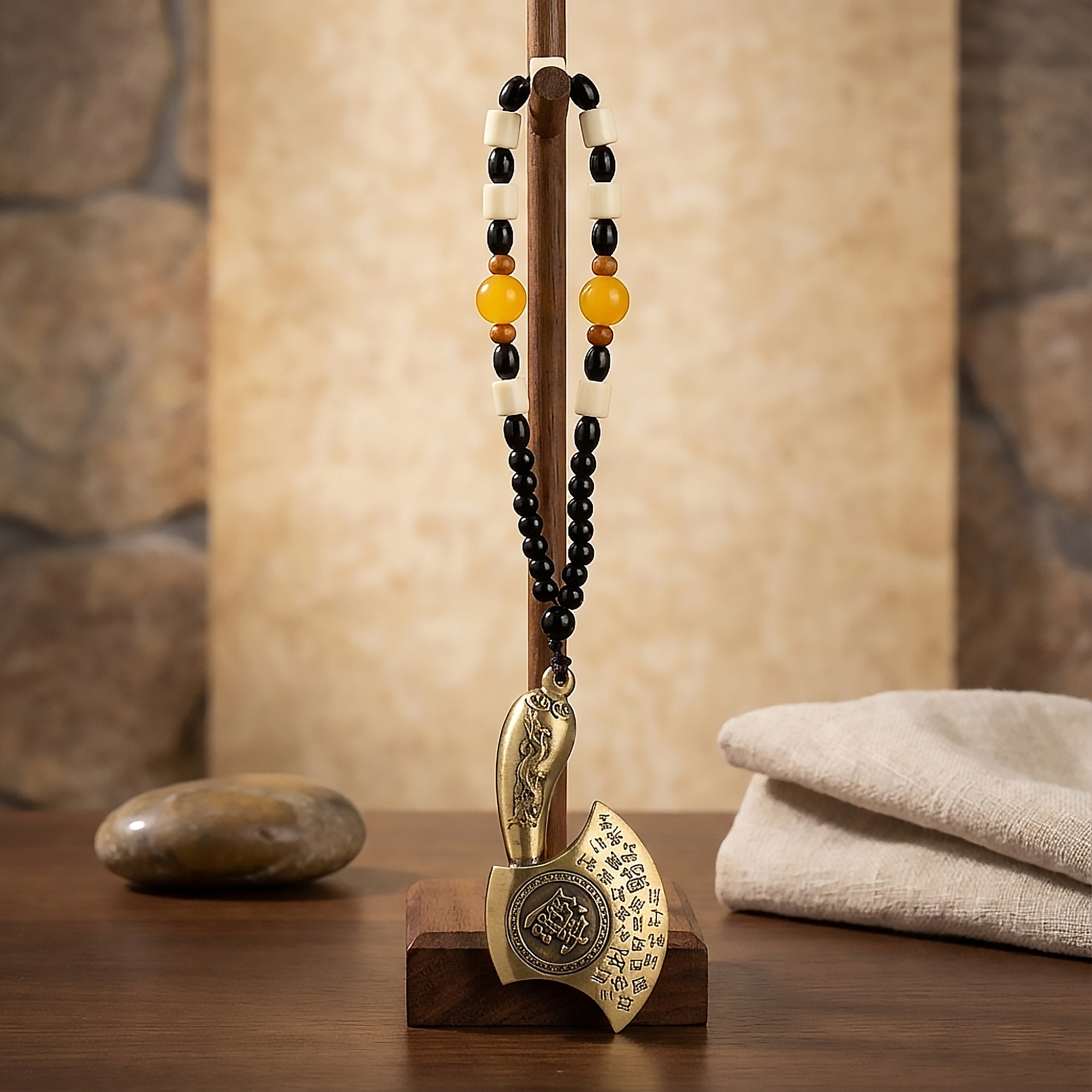 Tato závěsná sekera Feng Shui je založena na tradiční ceremoniální sekyře, která symbolizuje autoritu, ochranu a ochranu bohatství. V praxi Feng Shui představují motivy seker kontrolu nad zdroji a ochranu prosperity spíše než sílu nebo konflikt. Tento kus kombinuje symbolický význam s dekorativním vzhledem, takže je vhodný jak pro duchovní prostory, tak i pro interiéry.