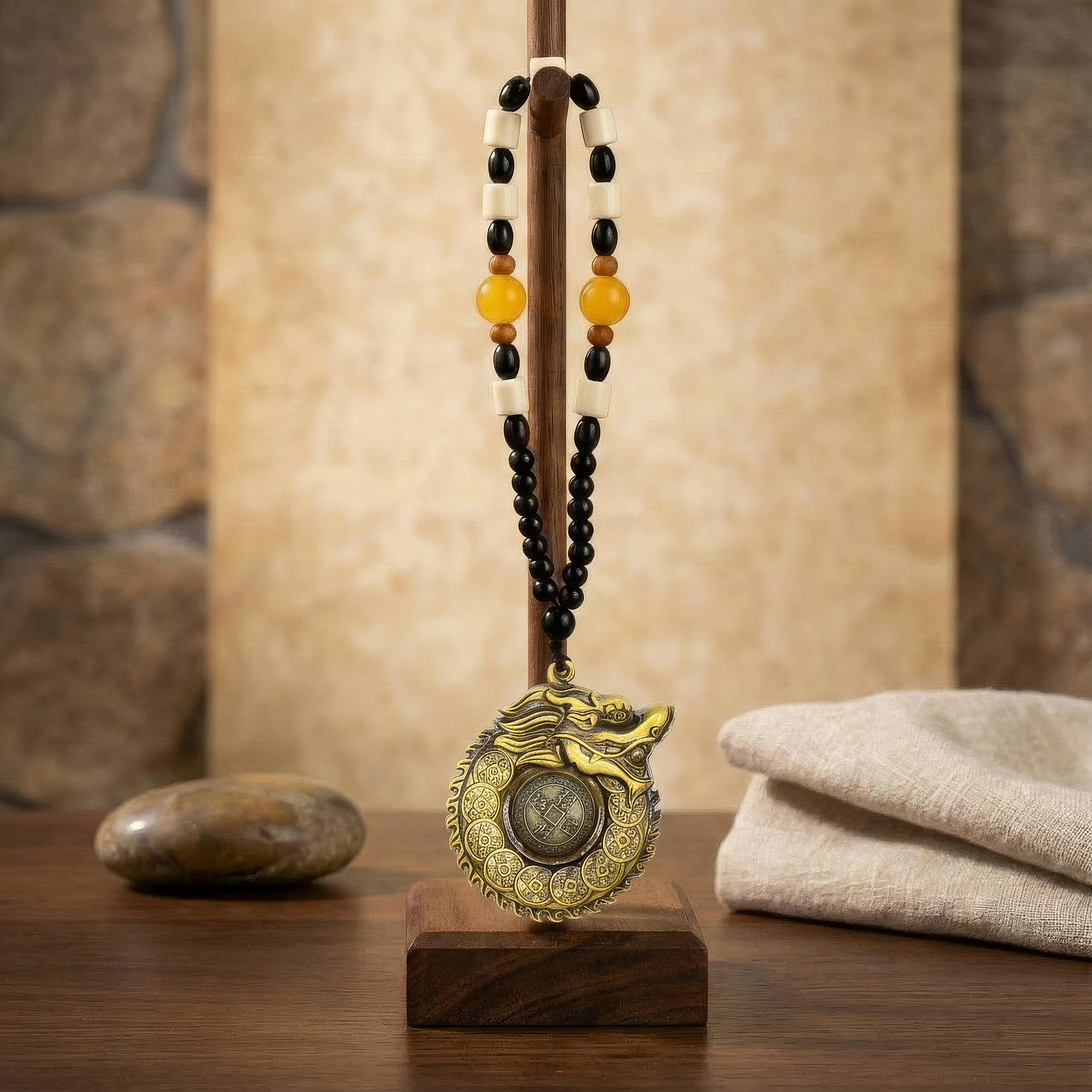 Tento závěs Feng Shui zobrazuje draka obklopujícího centrální minci bohatství, což je silný symbol ochrany, autority a dlouhodobé prosperity. V tradici Feng Shui drak představuje sílu, vůdcovství a úspěch, zatímco okolní forma symbolizuje bohatství, které je střeženo, kontrolováno a udržováno, spíše než snadno ztraceno.