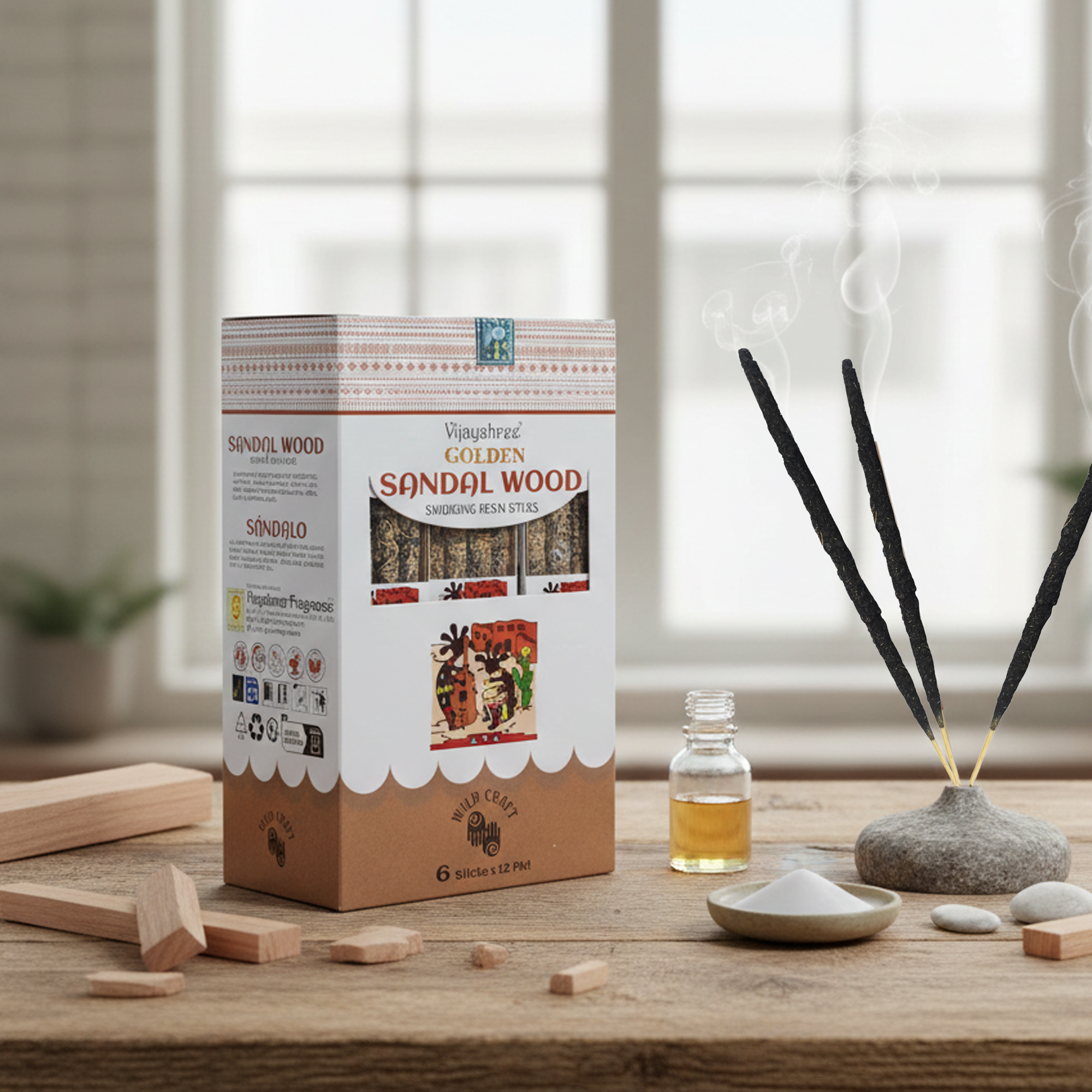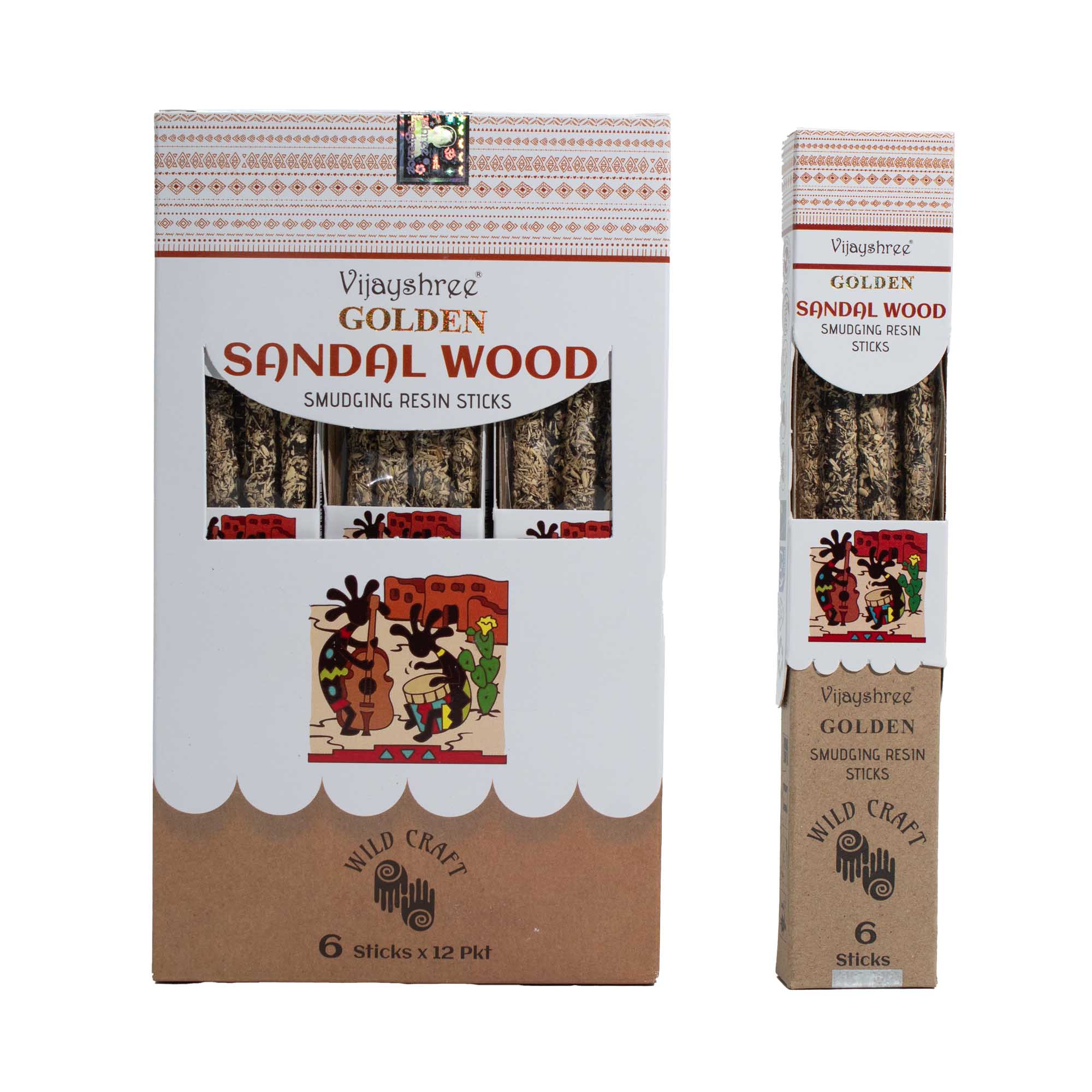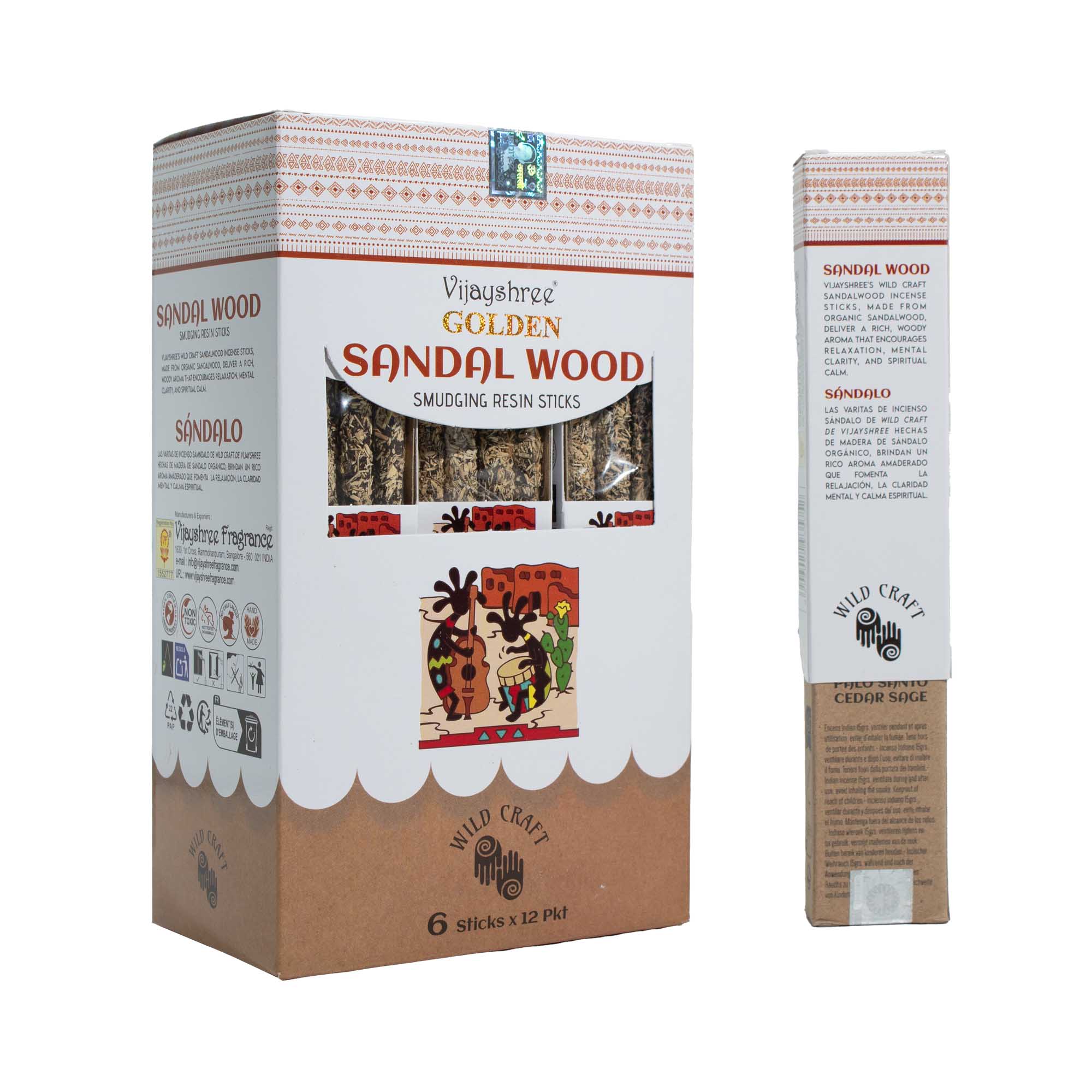 Každé velkoobchodní balení obsahuje 12 sad, po 6 vonných tyčinkách z přírodní pryskyřice v každé sadě (celkem přibližně 30 g). Santalové dřevo je tradičně ceněno pro svou bohatou, stálou vůni, často spojovanou s meditací, jasností a vytvářením vyvážené atmosféry. Směs zlaté pryskyřice umocňuje teplo dřevitých tónů a dodává vůni plnější a déle trvající charakter.