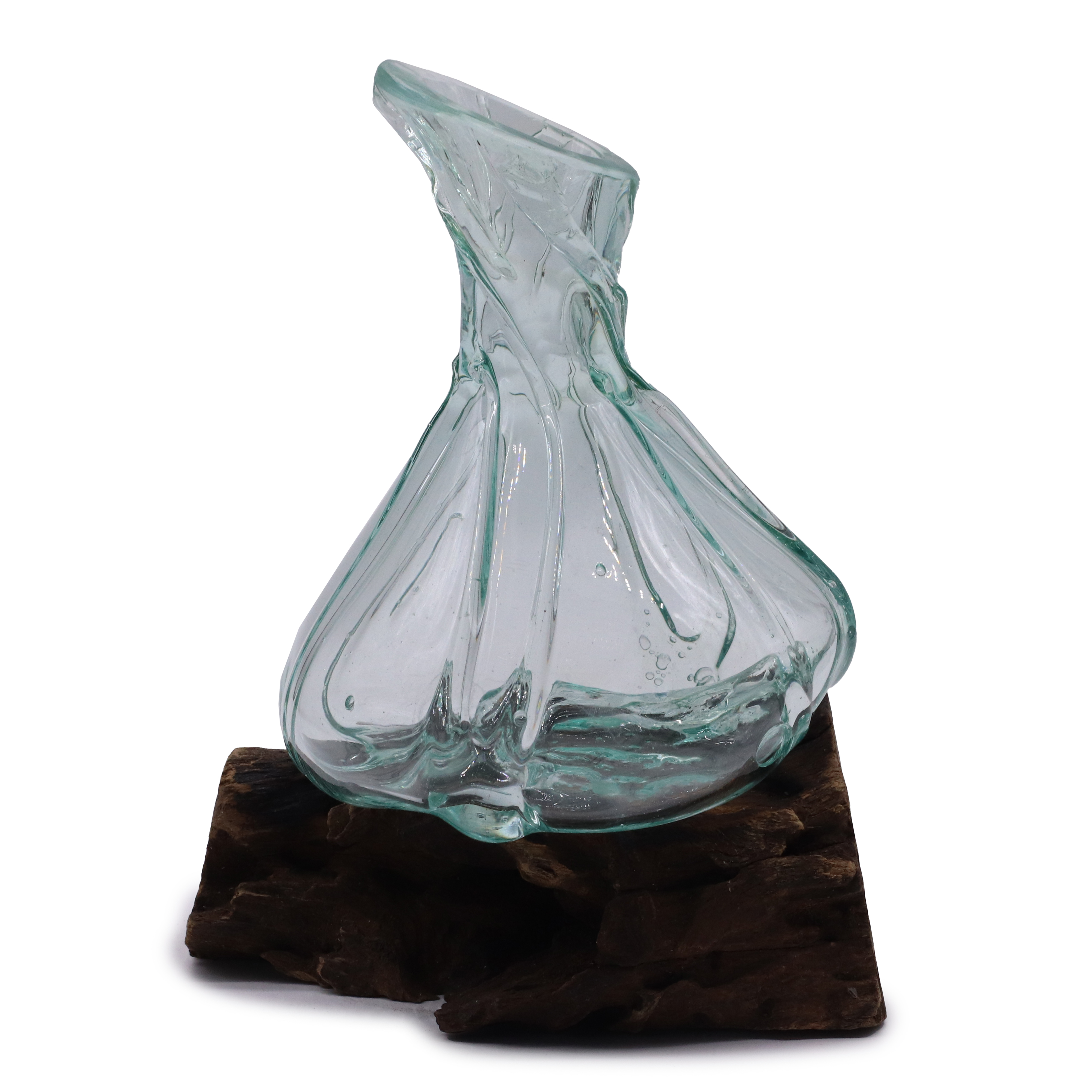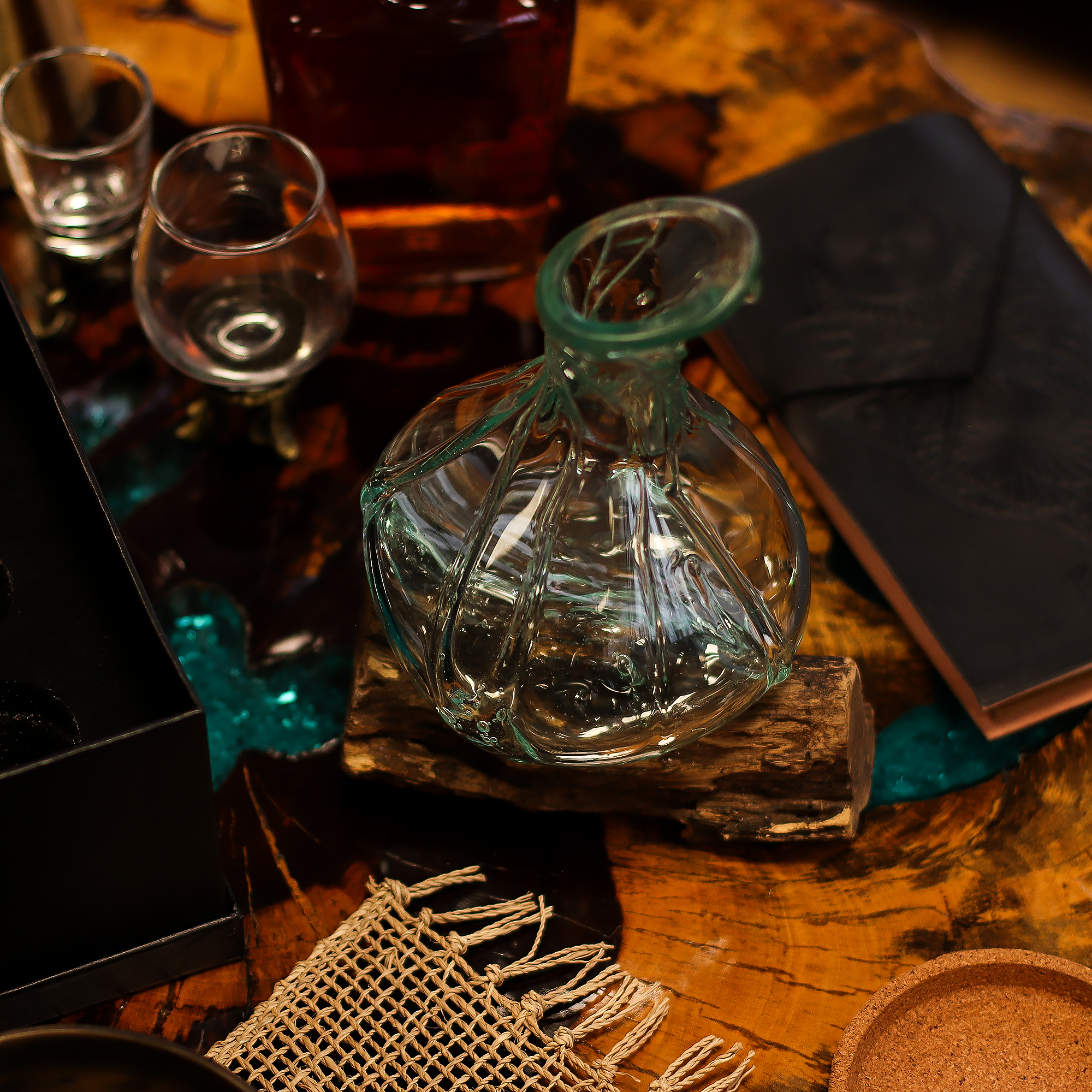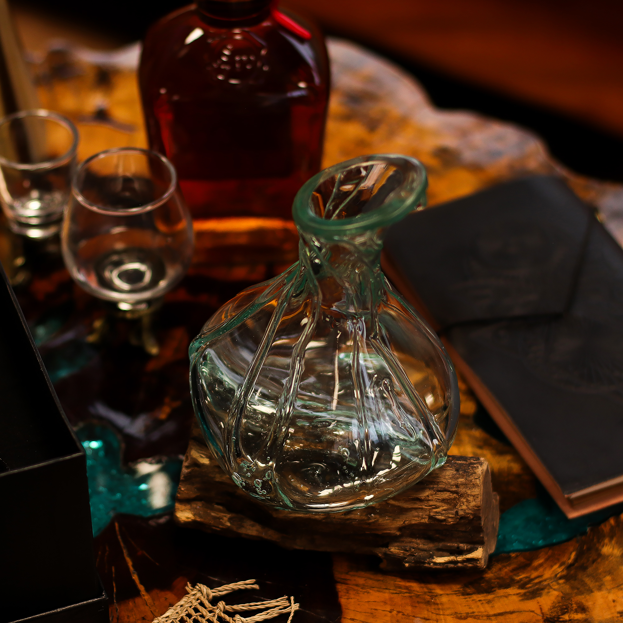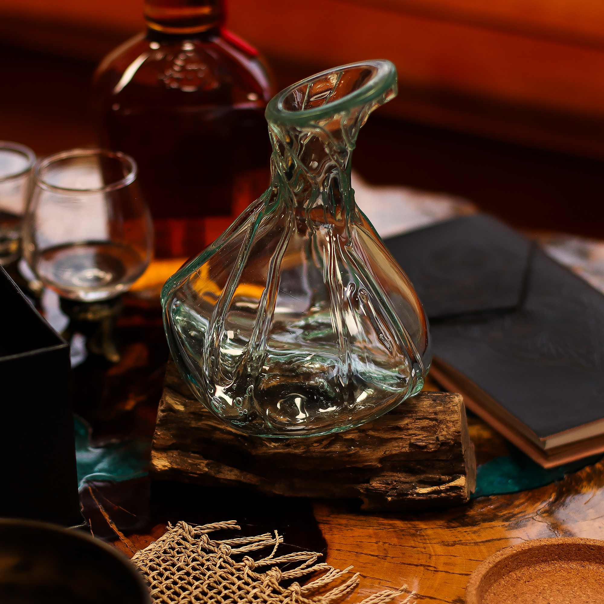 Tato karafa z roztaveného skla představuje tradiční balijské řemeslné umění v jeho nejrafinovanější podobě. Každá karafa je ručně foukaná z recyklovaného skla a elegantně spočívá na podstavci z přírodního dřeva, který se při chladnutí skla tvaruje tak, aby dokonale padl.