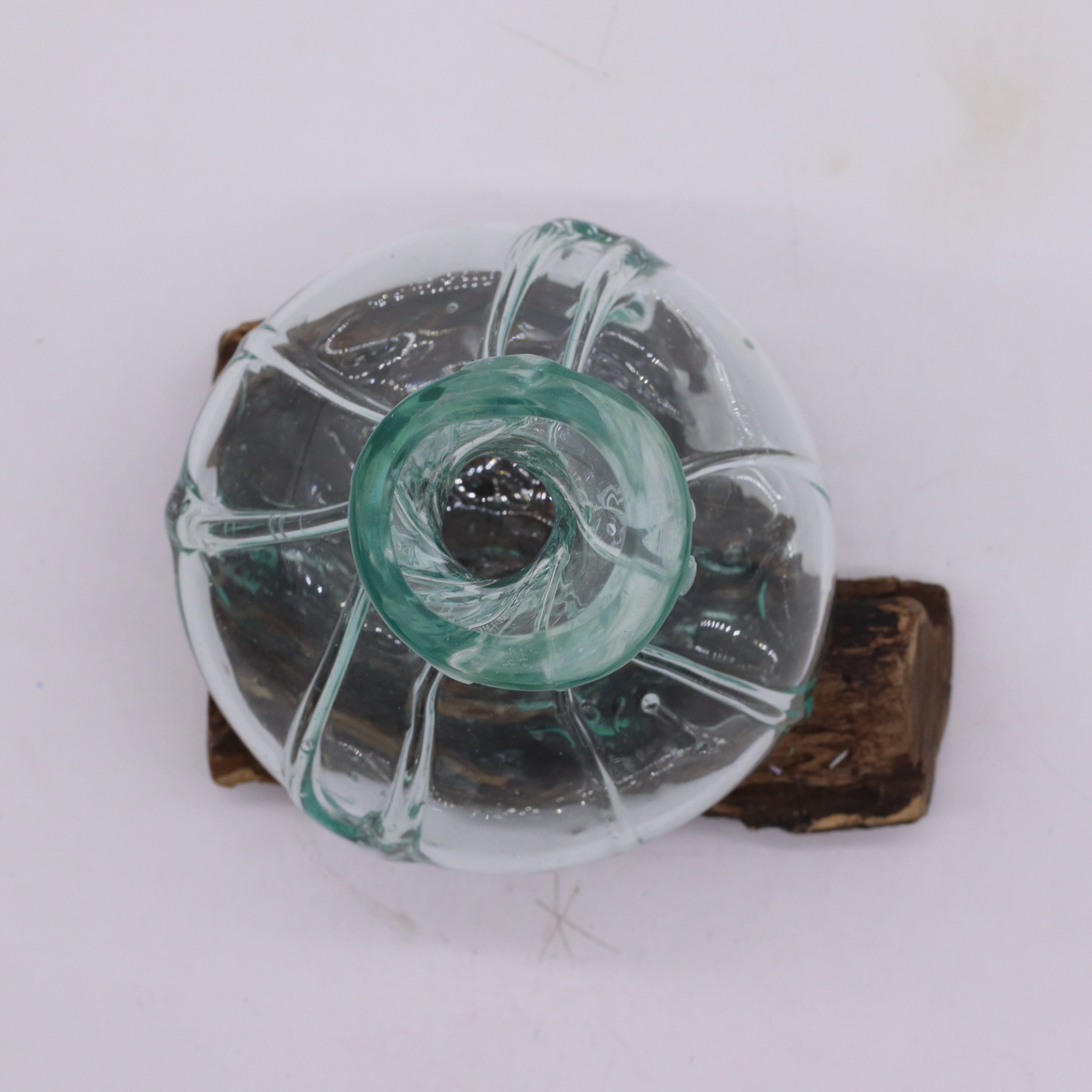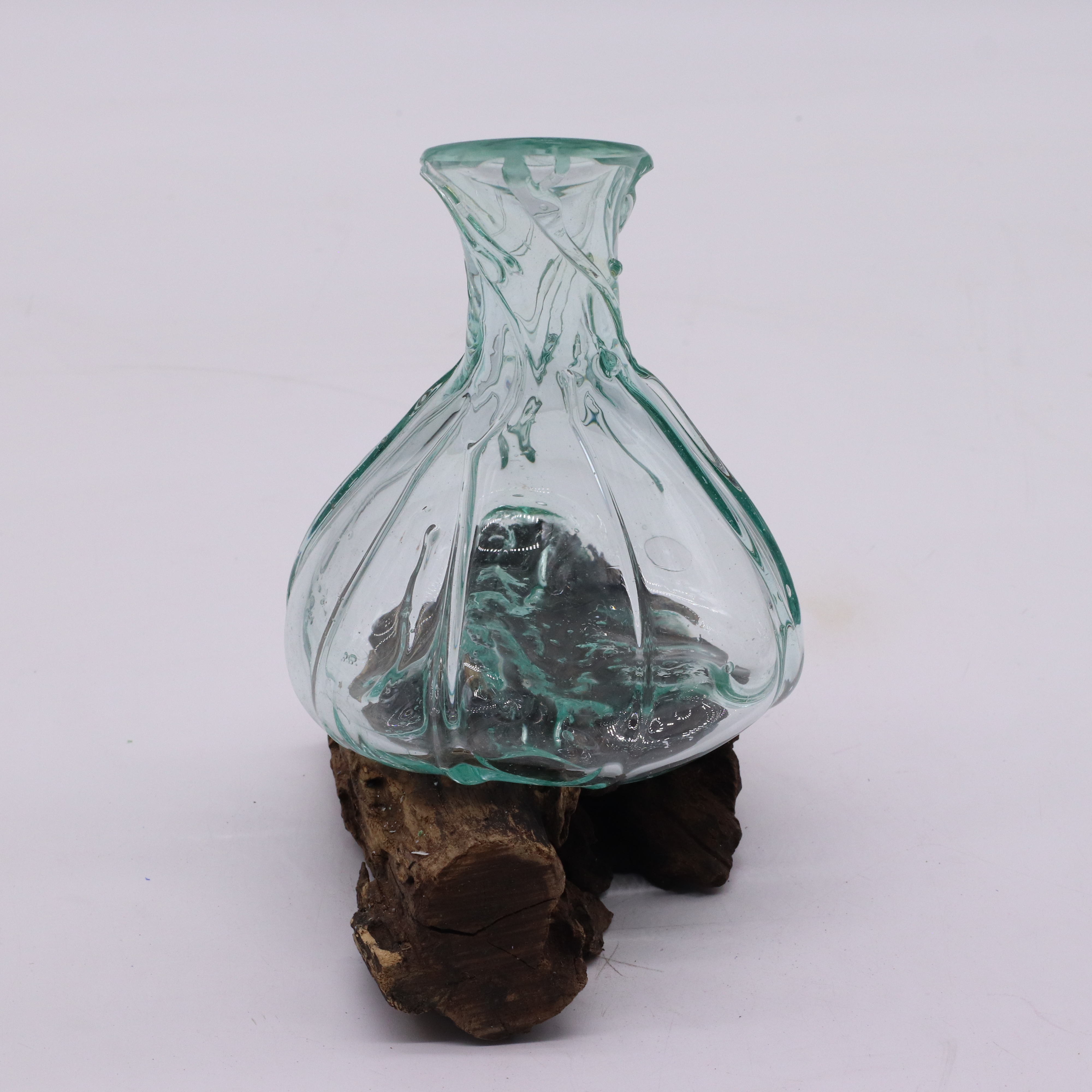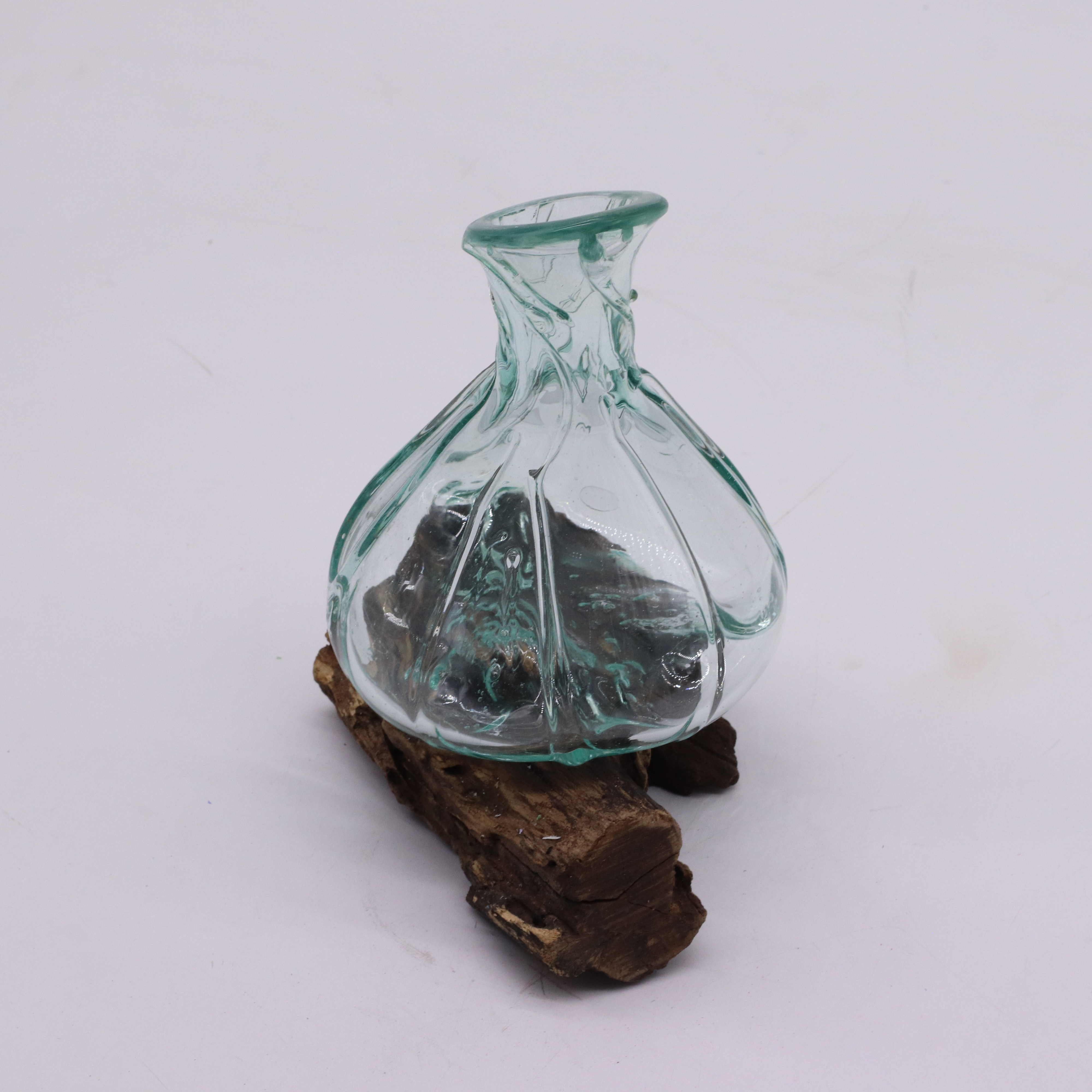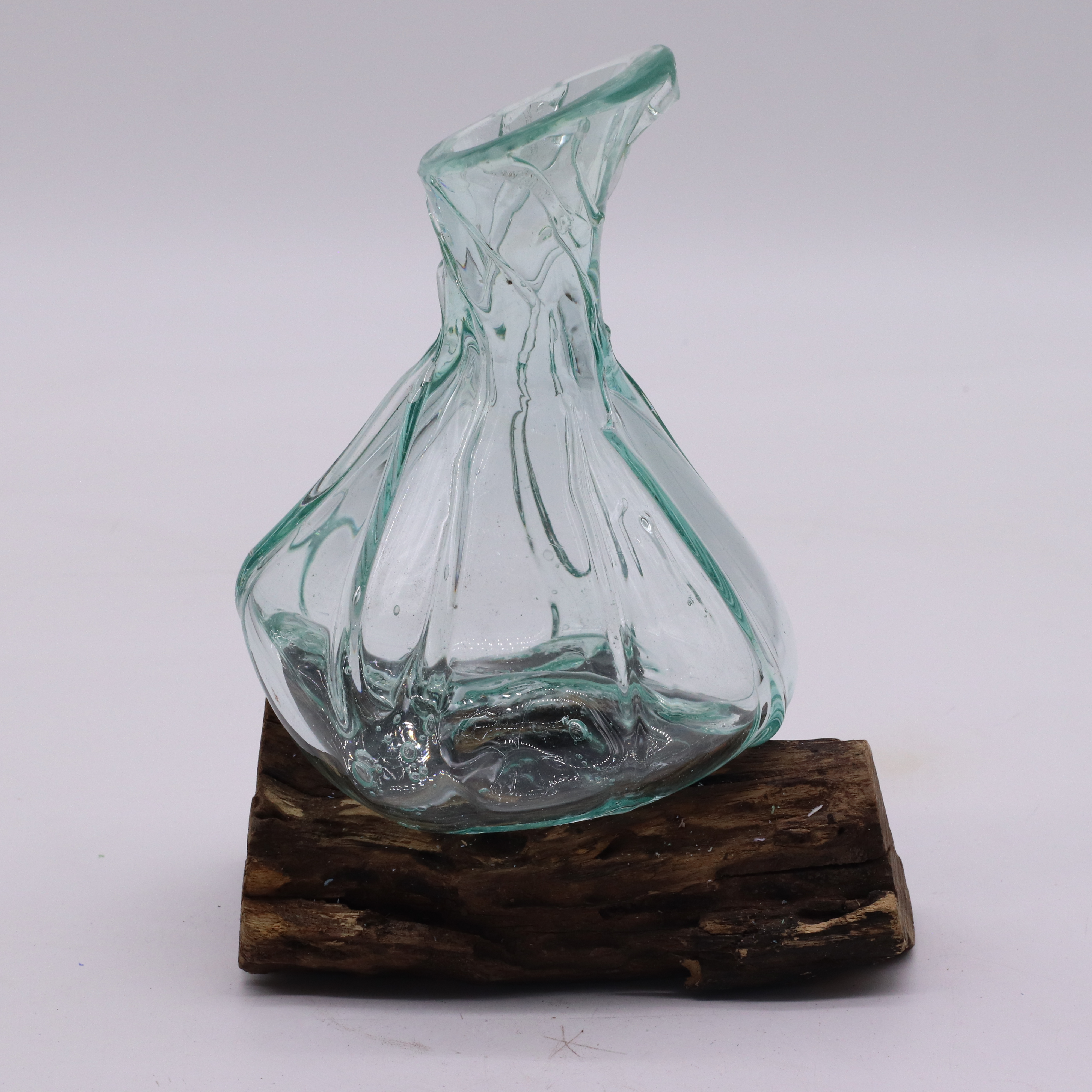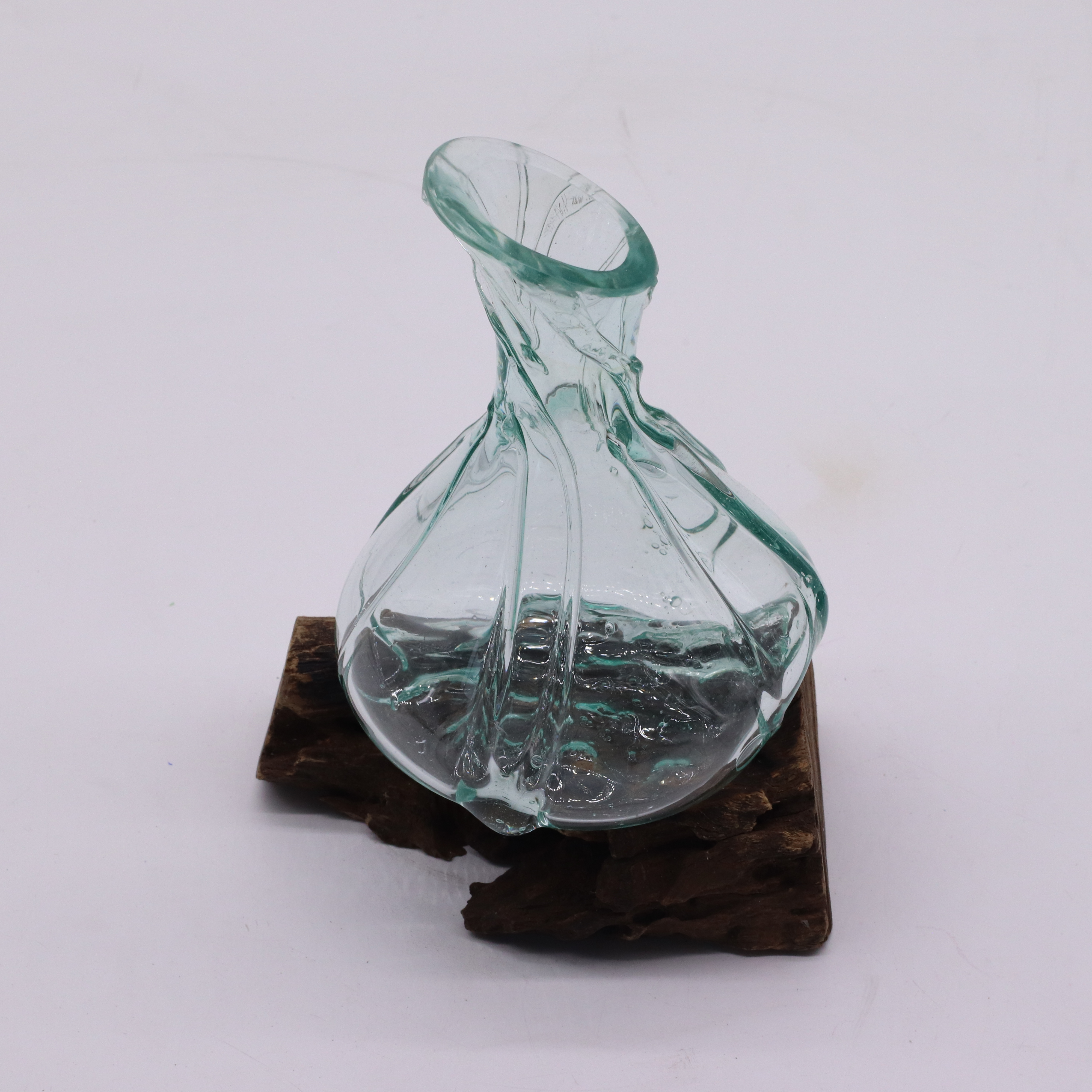 Tato karafa z roztaveného skla představuje tradiční balijské řemeslné umění v jeho nejrafinovanější podobě. Každá karafa je ručně foukaná z recyklovaného skla a elegantně spočívá na podstavci z přírodního dřeva, který se při chladnutí skla tvaruje tak, aby dokonale padl.