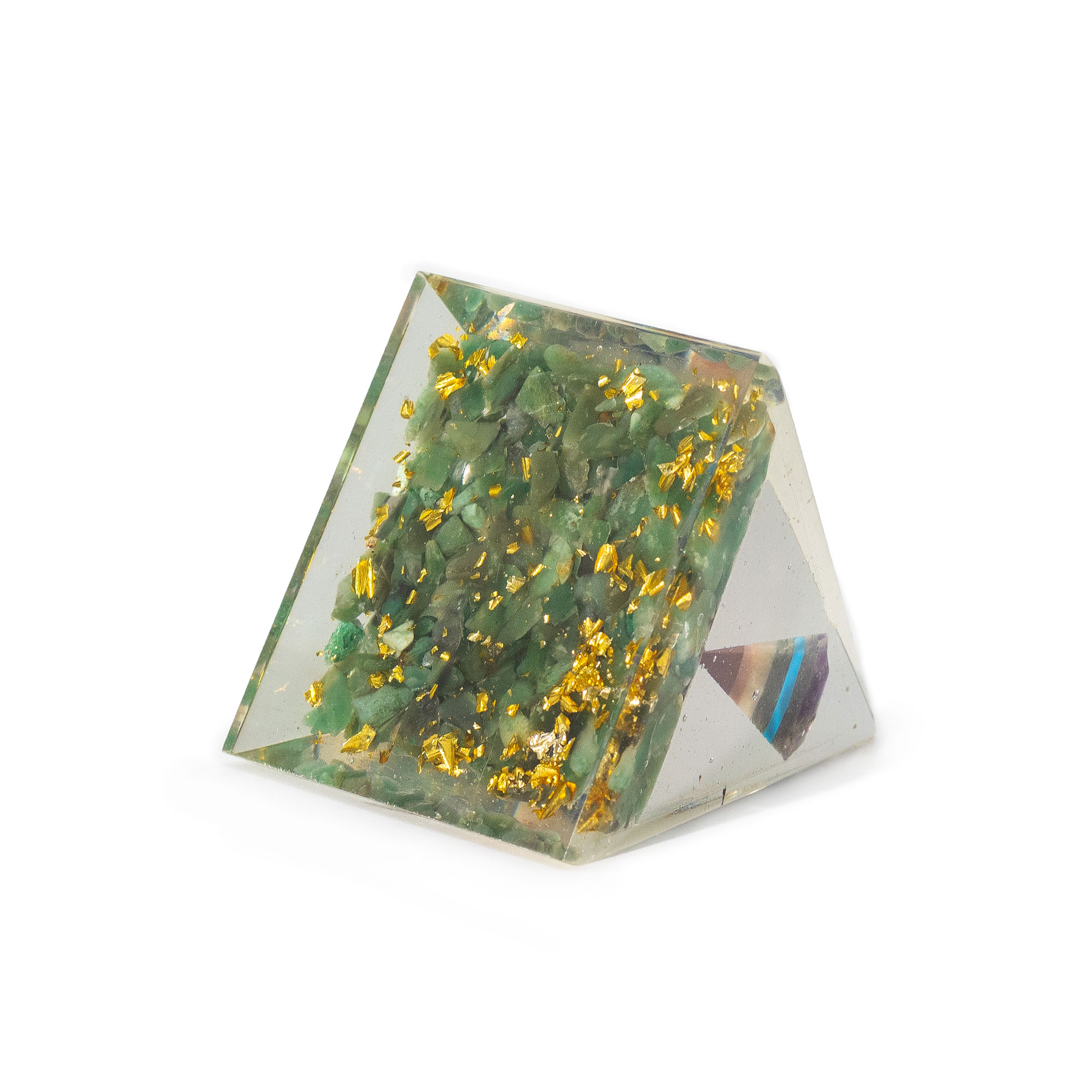 Dodá vaší sbírce krystalů pocit rovnováhy a obnovy se střední orgonitovou pyramidou – kyvadlem se zelenými avanturínovými chipsy.
