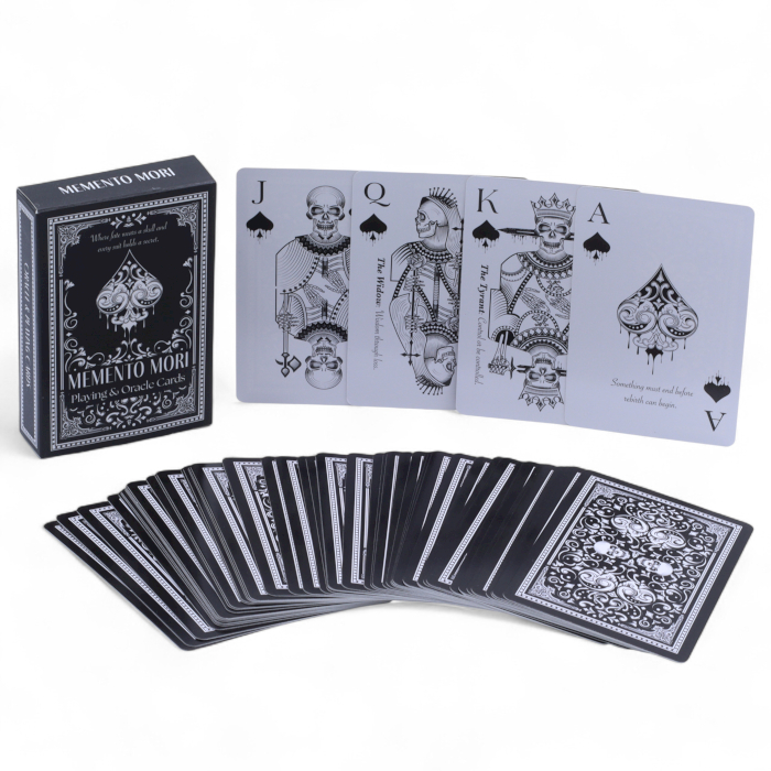 Každý balíček obsahuje 52 standardních karet plus 2 žolíky, vytištěných na vysoce kvalitním kartonu a papíru pro snadnou manipulaci a dlouhou životnost. Design Memento Mori je zdoben složitými motivy lebek a nadčasovými gotickými ozdobami – perfektní volba pro zákazníky, které přitahuje tajemno.