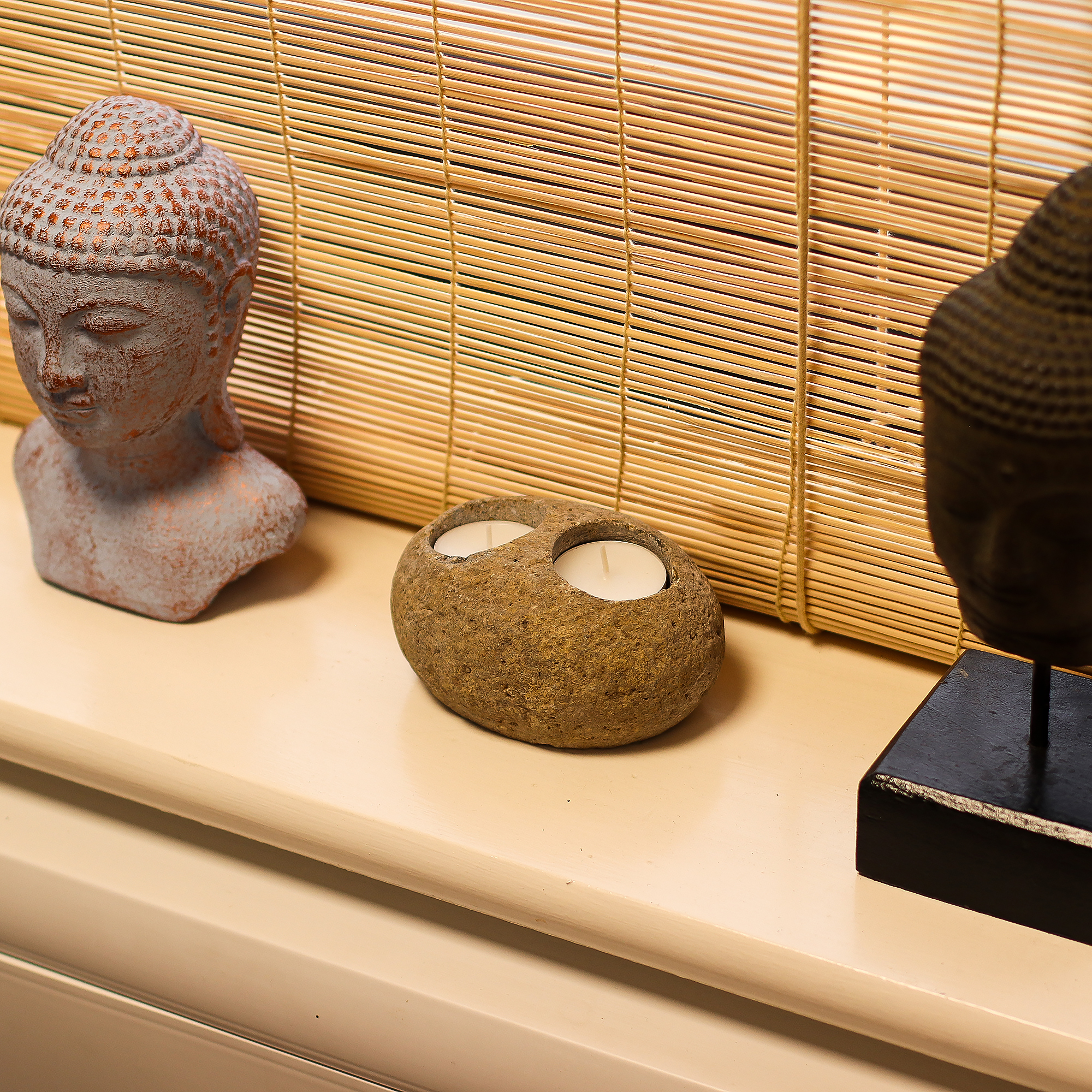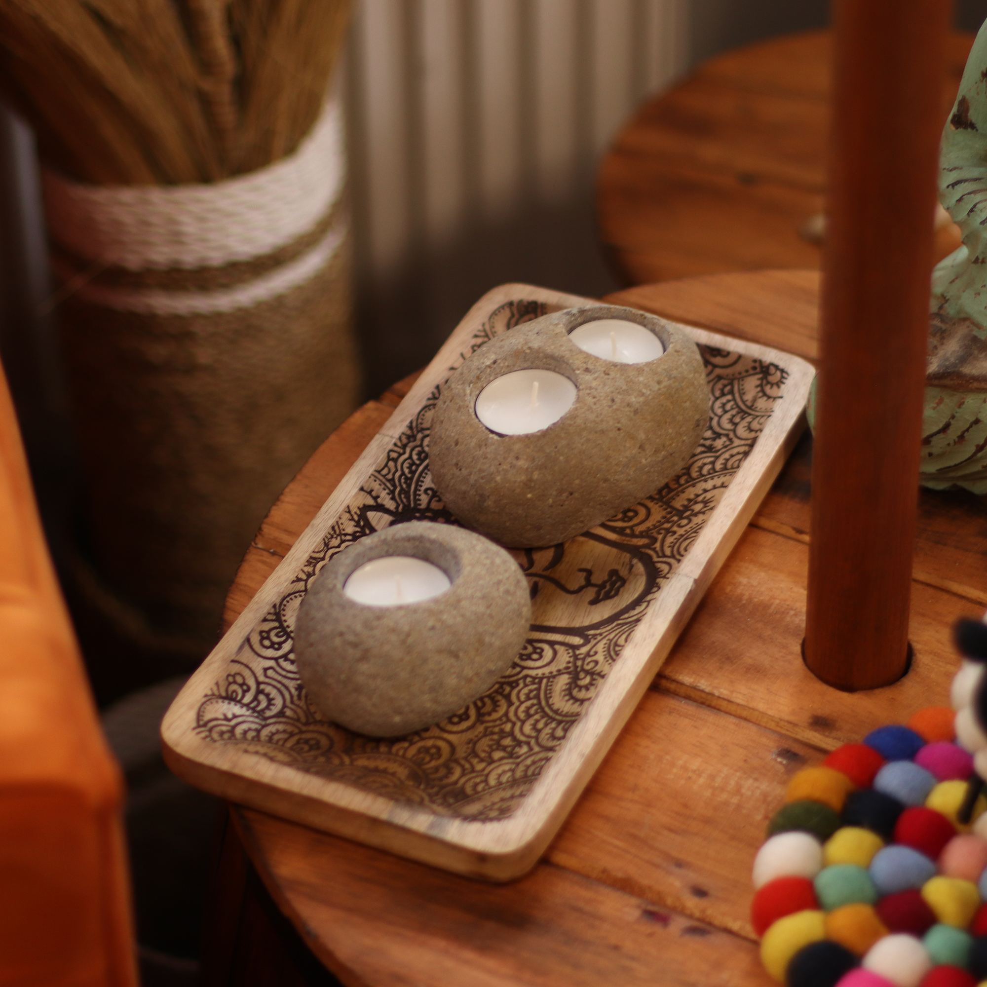 Každý kus je jedinečný a odráží přirozenou texturu a tón kamene, ze kterého byl vyřezán. Je navržen pro dvě čajové svíčky a je ideální pro vytvoření jemné, klidné atmosféry – perfektní pro relaxační koutky, wellness prezentace nebo dárkové kolekce inspirované přírodou.