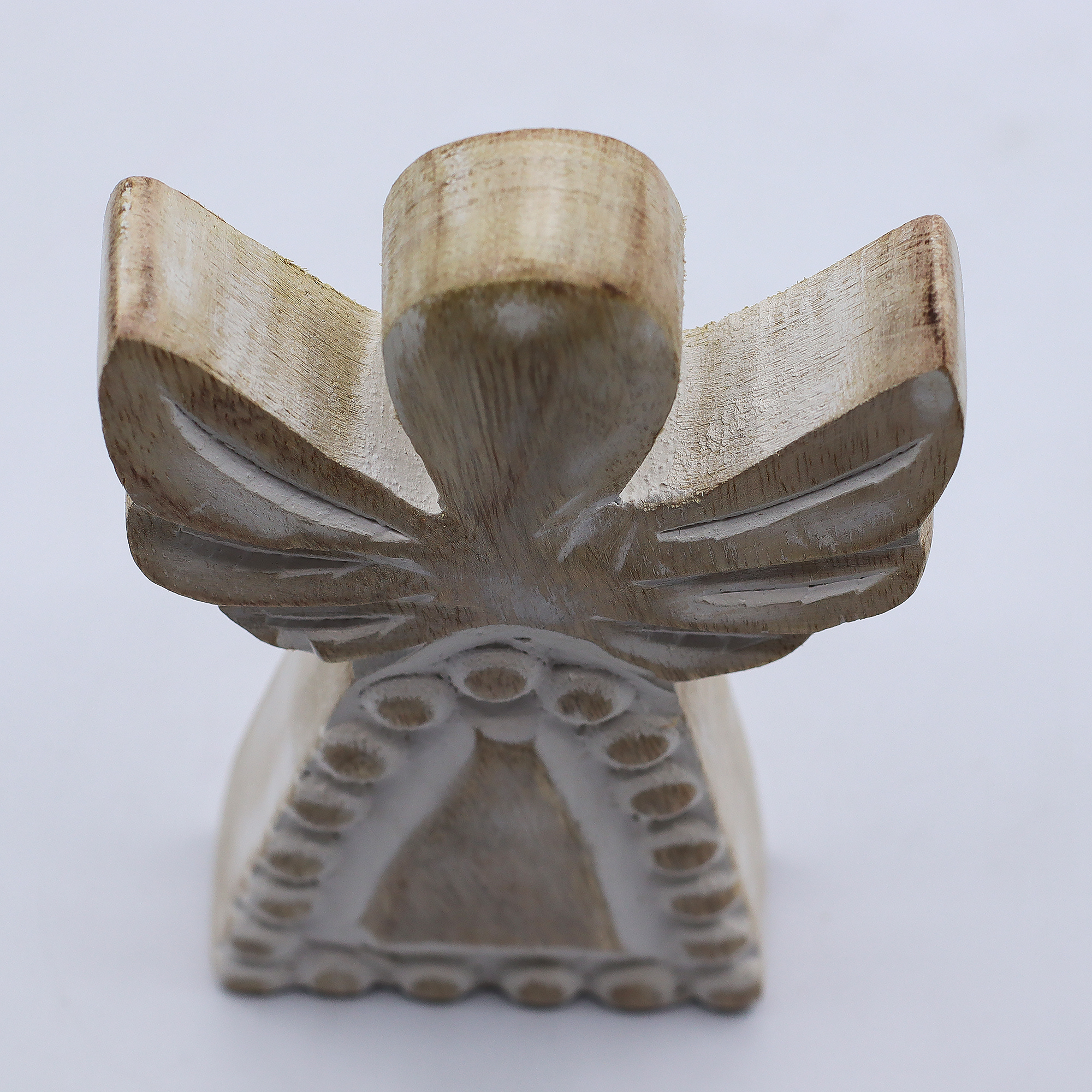 Je ručně vyřezávaný v Indii z udržitelného mangového dřeva a má jemnou bělenou povrchovou úpravu, která zdůrazňuje jeho přirozenou texturu. Každý kus je férově prodáván a vyroben individuálně. Tento všestranný anděl je ideální pro decentní dekorativní akcenty, promyšlené suvenýry nebo jako klidný doplněk jakékoli sezónní dekorace.