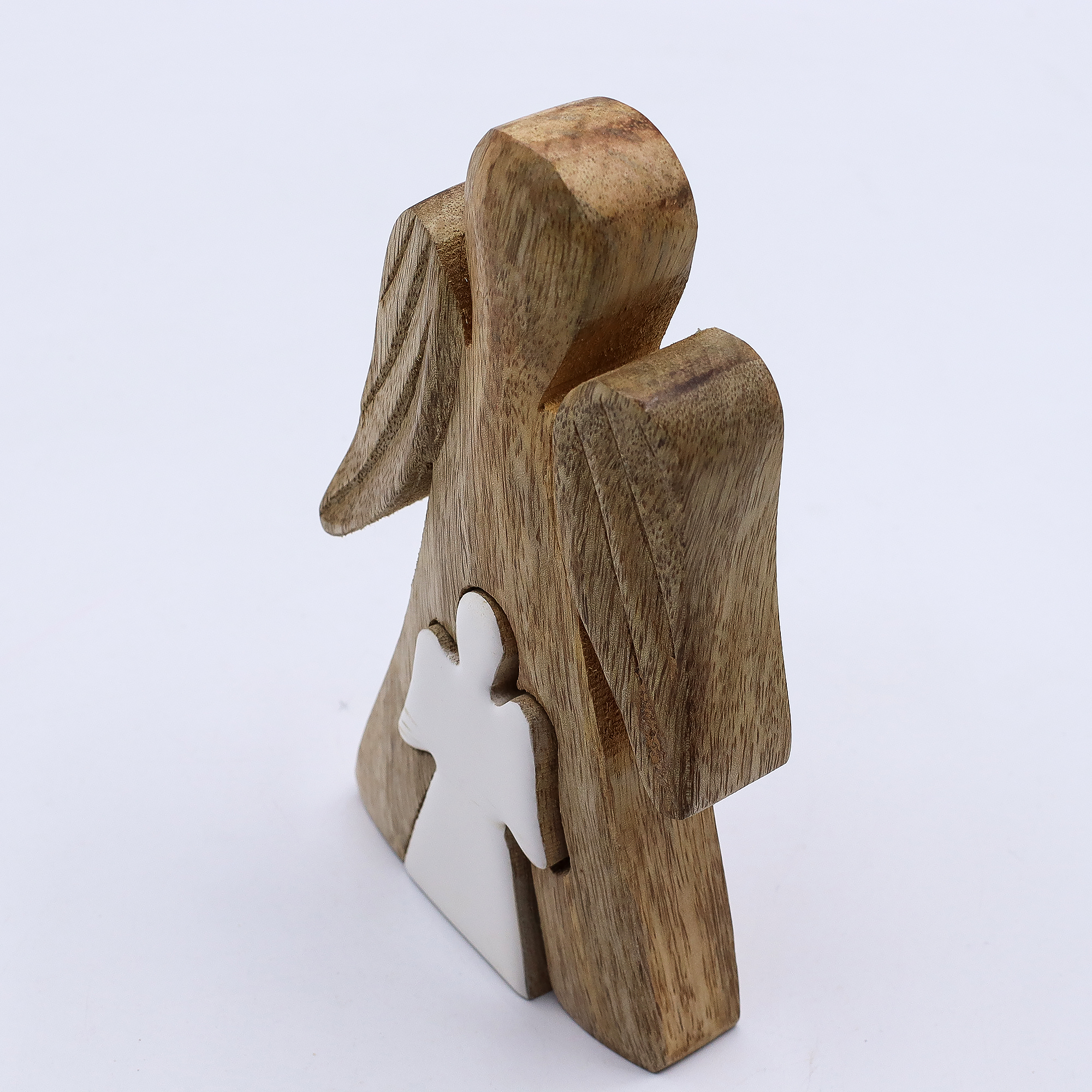 Tento úchvatný 15cm anděl z mangového dřeva s bílým smaltem představuje jedinečný design anděla v andělovi, který kombinuje nadčasový tvar s moderním nádechem.