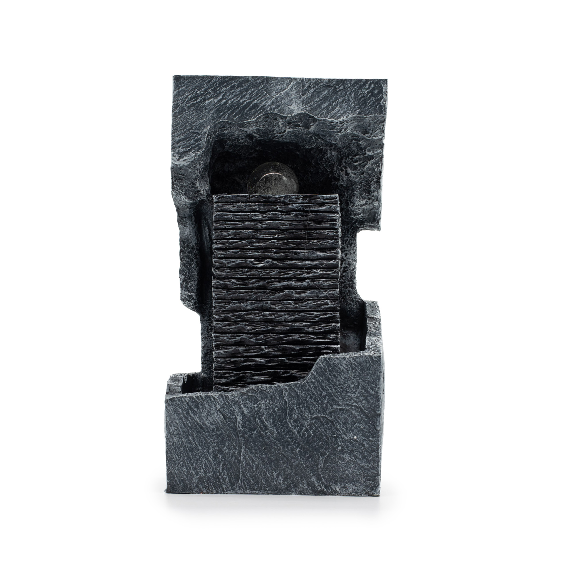 Voda plynule stéká po žebrovaném centrálním sloupu do podstavce, zatímco křišťálová koule slouží jako ústřední bod a je osvětlena LED světlem, které mění barvu a odráží se od vody a texturovaných povrchů. Tento prvek s tmavým kamenným efektem a výrazným vertikálním profilem se hodí do moderních interiérů, od recepcí a lázeňských prostor až po wellness studia a minimalistické domy.