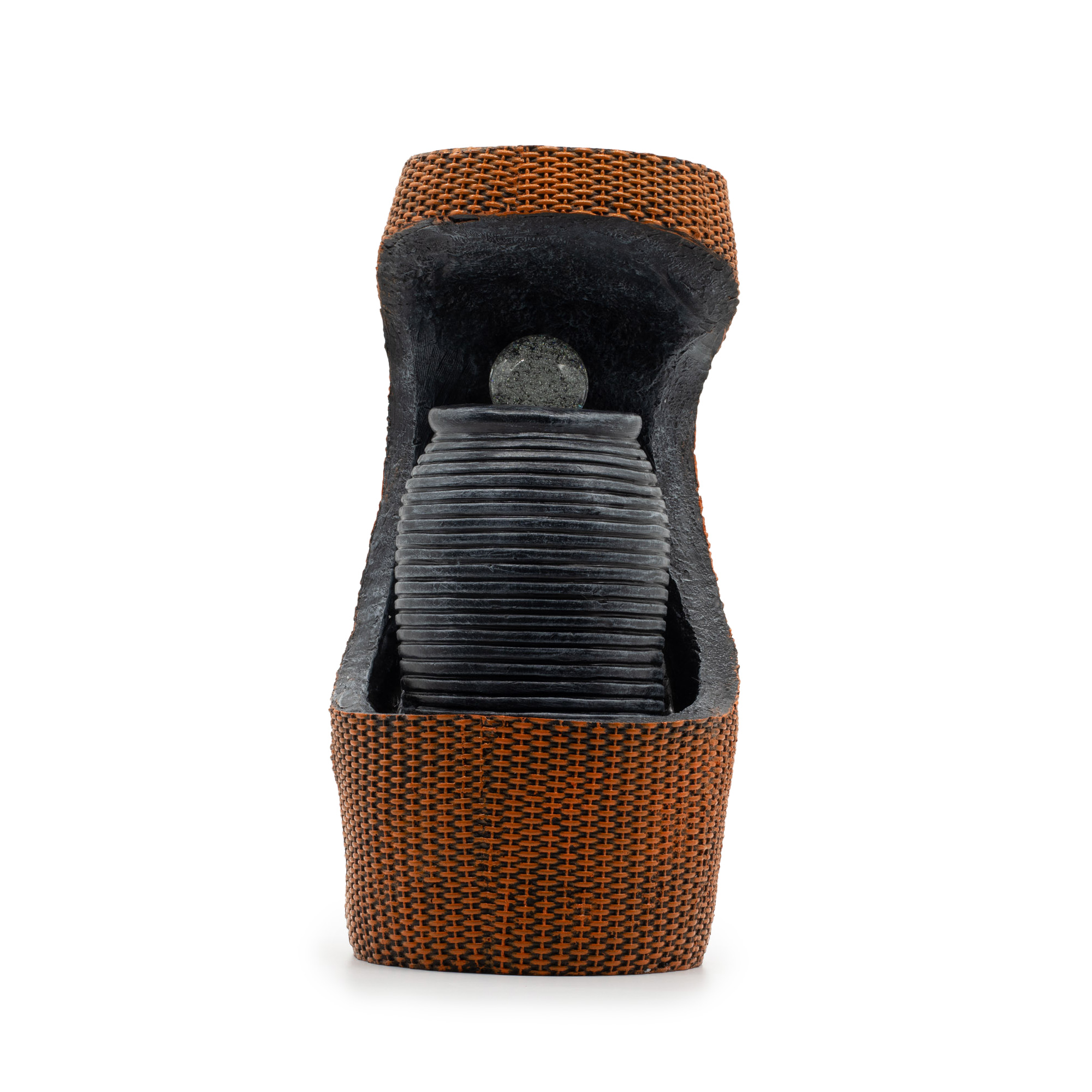Voda jemně proudí přes urnu směrem ke křišťálové kouli v horní části, kde LED světlo s proměnlivou barvou vytváří jemnou, proměnlivou záři, která se odráží skrz pohybující se vodu. Směs tmavých kamenných tónů a teplých tkaných detailů dodává designu hloubku, aniž by to přehlušilo design.