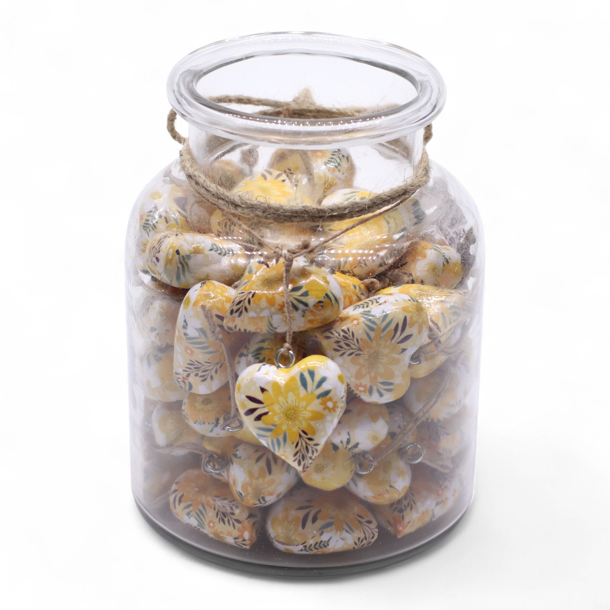 Oživte svou vánoční aranžmá touto veselou sklenicí s přibližně 50 velkými žlutými květinovými dekoračními dřevěnými srdíčky, každé z nich má zářivý vintage vzor. Jejich slunečný vzhled vnáší hřejivý nádech do vánoční výzdoby, je vhodným dárkem nebo je lehkým a povznášejícím akcentem do jakéhokoli interiéru.