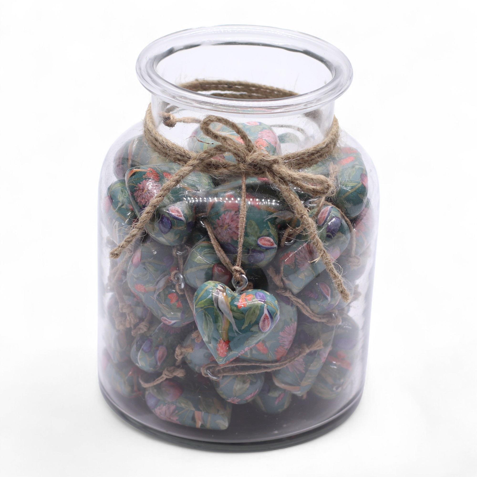 Obohaťte svůj sezónní sortiment touto okouzlující sklenicí s motivem ptáčků a květin, která pojme přibližně 50 velkých dřevěných srdíček s motivem ptáků a květin. Každé srdíčko má roztomilý ptačí a květinový design, který dodává vánočním dekoracím jemný, pohádkový nádech, dárkům z upřímnosti nebo povznášejícím akcentům v domácnosti. Ideální pro zdobení stromků, zdobení věnců, personalizaci svátečních dárkových košů nebo pro drobné suvenýry, o které se zákazníci rádi dělí.